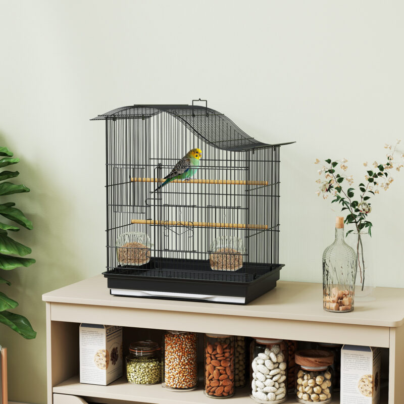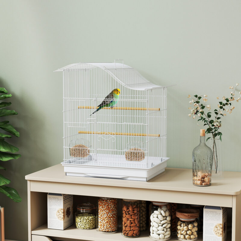Gabbia per Uccelli a 4 Porte con 2 Ciotole, 2 Posatoi e Vassoio, in Metallo e Plastica, 47,5x36x54,5 cm, Bianco
