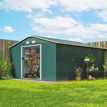 Casetta da Giardino con 2 Porte Scorrevoli e 4 Prese d’Aria in Acciaio, 340x386x2cm, Verde