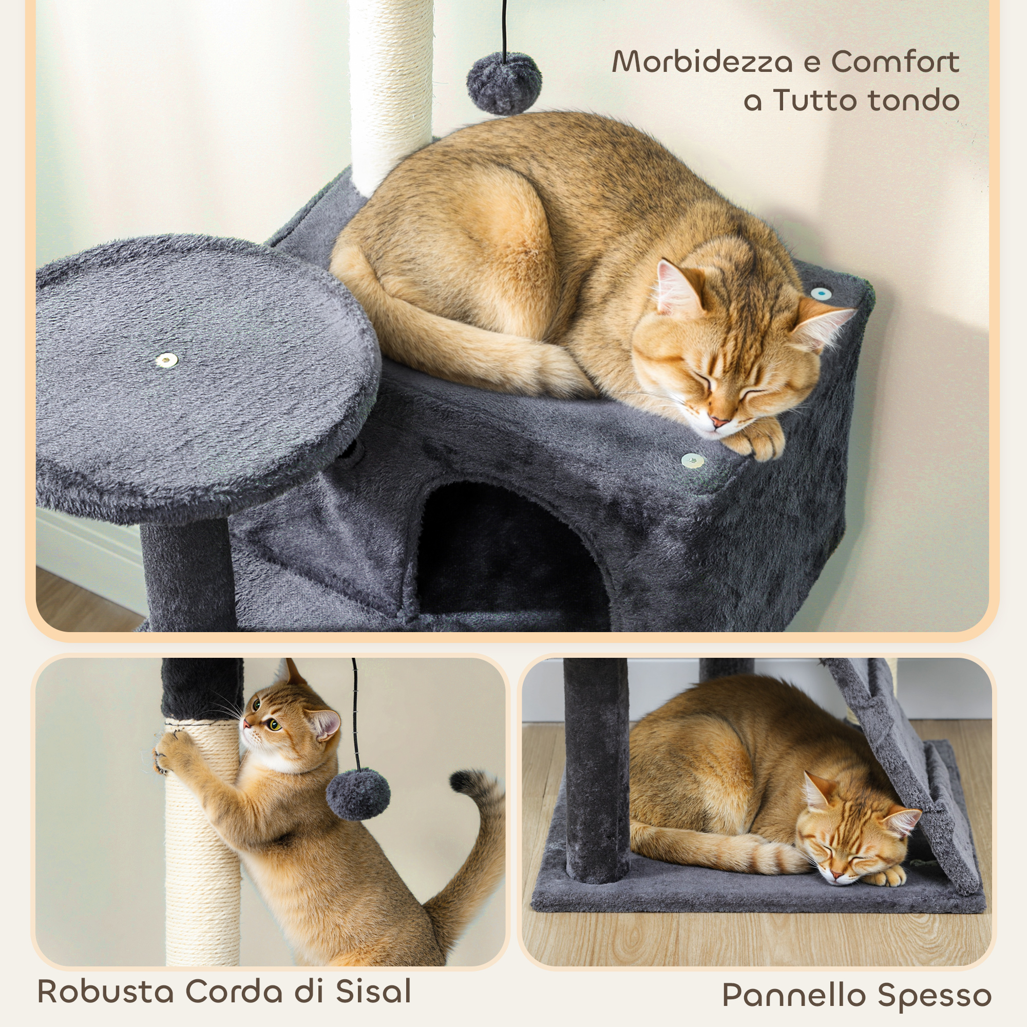 Albero per Gatti Alto 140 cm con 2 Casette, Lettino e Amaca per 2-3 Gatti, Rivestimento Peluche, Grigio