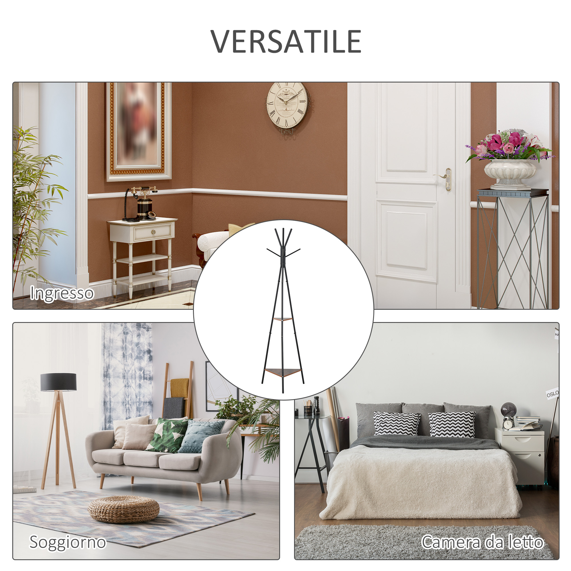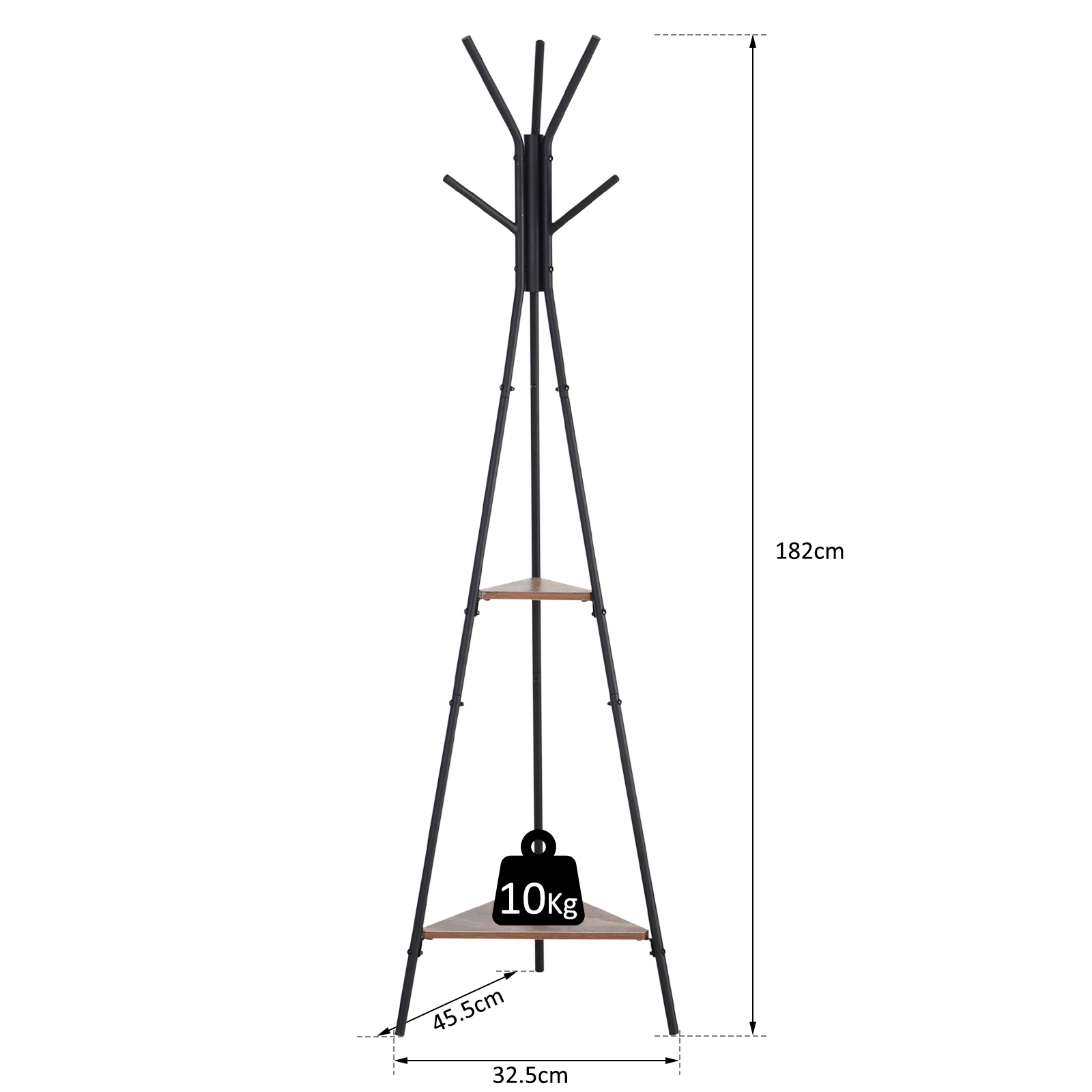 Appendiabiti da Terra con 2 Ripiani e 6 Ganci, Attaccapanni ad Albero in Stile Industriale, 46x52x182 cm, Nero e Marrone