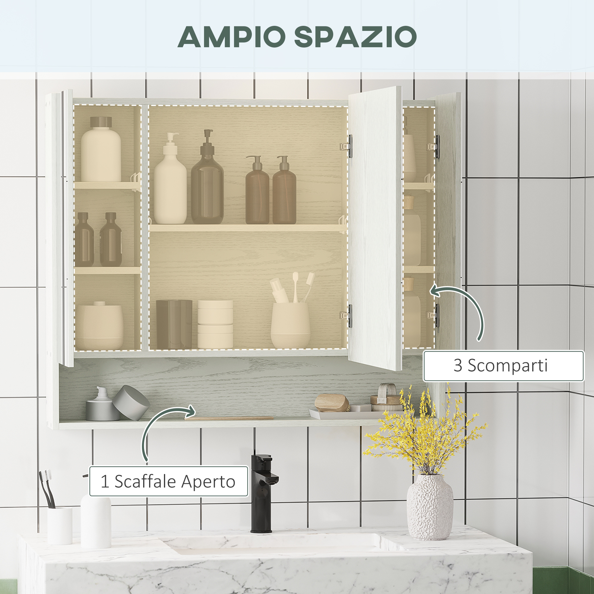 Armadietto con Specchio a 4 Sezioni con Ripiani Regolabili, Specchiera Bagno in Legno e Vetro, 90x15x75 cm, Bianco