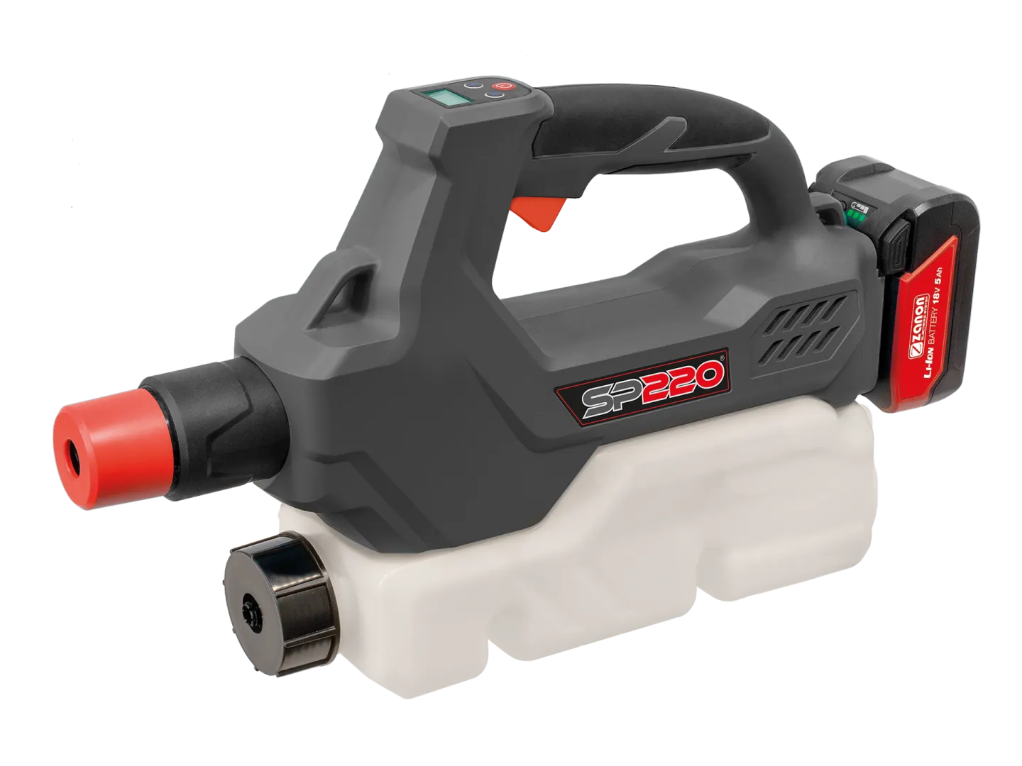Il liquido atomizzato viene ridotto in particelle piccolissime (60 μm) così da irrorare in maniera uniforme tutte le superfici da trattare, riuscendo anche a depositarsi in aree difficili da raggiungere. Ha una gittata di 3,5 m ed essa è regolabile elettronicamente.