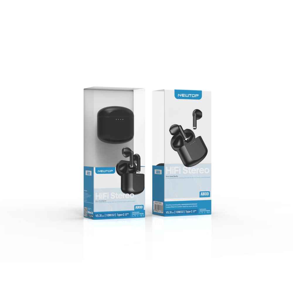Auricolari Bluetooth 5.3 NEWTOP AB33Auricolari Bluetooth 5.3 NEWTOP AB33: Audio e Comfort Senza FiliPanoramica del ProdottoGli auricolari wireless NEWTOP AB33 sono progettati per offrire un’eccellente qualità audio con la praticità della tecnologia True Wireless Stereo (TWS). Grazie al Bluetooth 5.3, garantiscono una connessione stabile e duratura, ideali per l’uso quotidiano, sia per ascoltare musica che per effettuare chiamate.Caratteristiche PrincipaliTrue Wireless Stereo (TWS): Esperienza audio completamente senza fili con suono stereo di alta qualità.Bluetooth 5.3: Connessione stabile e veloce con un raggio d’azione fino a 10 metri.Design Ergonomico: Progettati per una vestibilità comoda e sicura.Autonomia: Fino a 4-5 ore di riproduzione continua con una singola carica.Custodia di Ricarica: Capacità di 300mAh, permettendo più ricariche per gli auricolari durante la giornata.Specifiche TecnicheVersione Bluetooth: 5.3Distanza di Trasmissione: Fino a 10 metriCapacità Batteria Auricolari: 30mAh ciascunoDurata della Batteria: 4-5 ore di utilizzo continuoCapacità Batteria Custodia: 300mAhTempo di Ricarica: Circa 1 oraColore: Nero o BiancoPeso: Leggero e portatileContenuto della Confezione2 x Auricolari Wireless NEWTOP AB331 x Custodia di ricarica1 x Cavo di ricarica USBGli NEWTOP AB33 sono perfetti per chi cerca un’esperienza audio senza fili di alta qualità, con una lunga durata della batteria e un design elegante e comodo. Ideali per chi desidera un ascolto senza interruzioni e pratico durante la giornata.