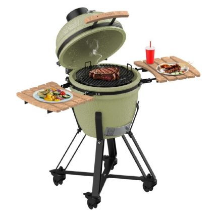 Barbecue in ceramica con resistenza fino a 1000°C, supporto in ghisa e controllo del flusso d’aria.