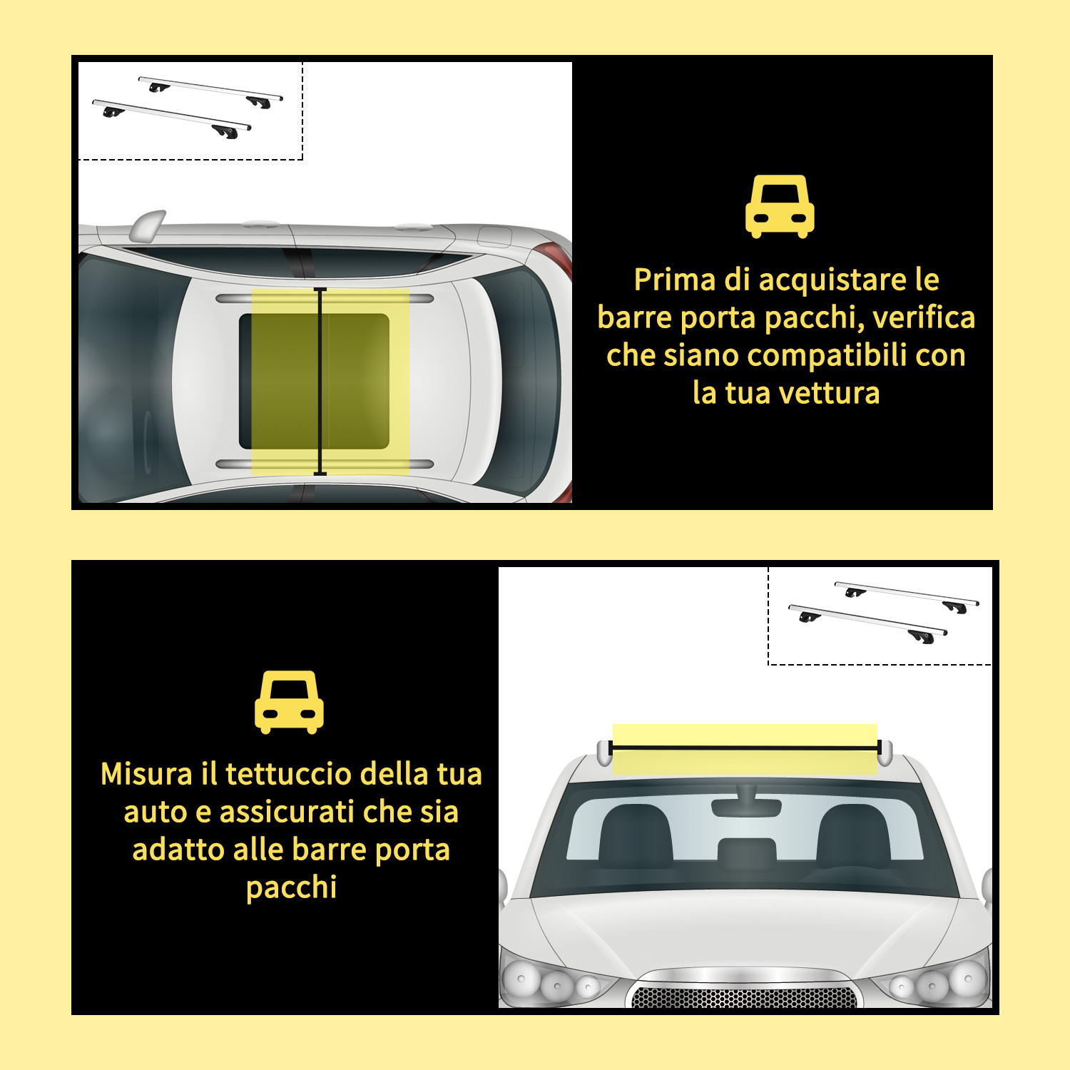 - • Barre portapacchi adatte a 2 tipi di tetti che presentano uno spazio tra la barra e il tetto oppure con scanalature o pendenze all’esterno