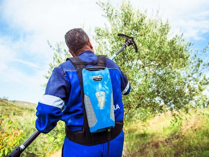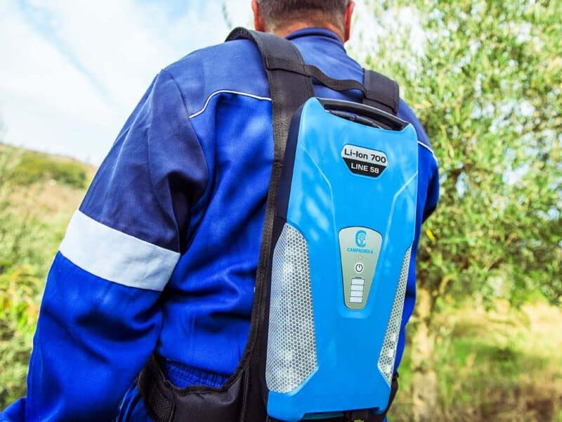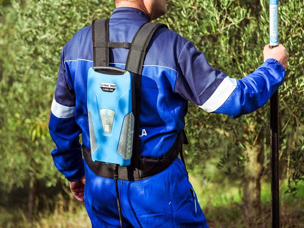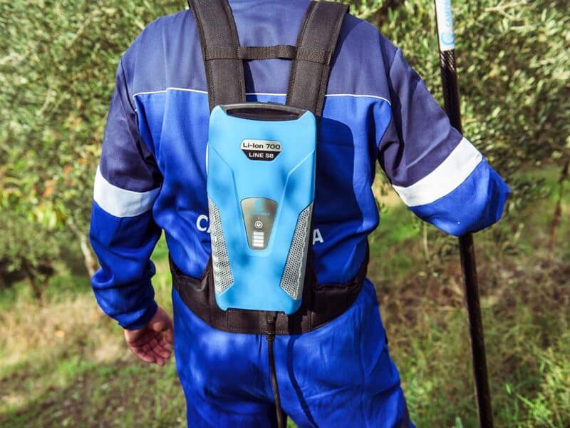 Con 705,6 W/h di potenza per soli 3,7 kg, la batteria agli ioni di litio Li-Ion 700 alimenta tutta la Line 58, formata dagli abbacchiatori elettrici ALICE STAR 58 Plus, ICARUS V1 58 ed HERCULES 6 58, per 8 ore di raccolta, dal potatore elettrico a catena KRONOS 58 600 tagli di diametro di 10 cm (circa un’intera giornata di lavoro), come pure dalle forbici elettriche COBRA PRO, per oltre 30 ore di potatura. Il design è studiato per renderla piccola e poco ingombrante, così da non appesantire l’operatore e non impedirlo nei movimenti. Lo zaino è ergonomico e traspirante e possiede un rinforzo lombare per poter lavorare nel rispetto della salute dell’utilizzatore. I LED sul retro della batteria consentono di visualizzare il livello di carica in ogni momento. Queste batterie non risentono di problemi di surriscaldamento. Sono senza “effetto memoria” e possono essere ricaricate anche se non completamente scariche.