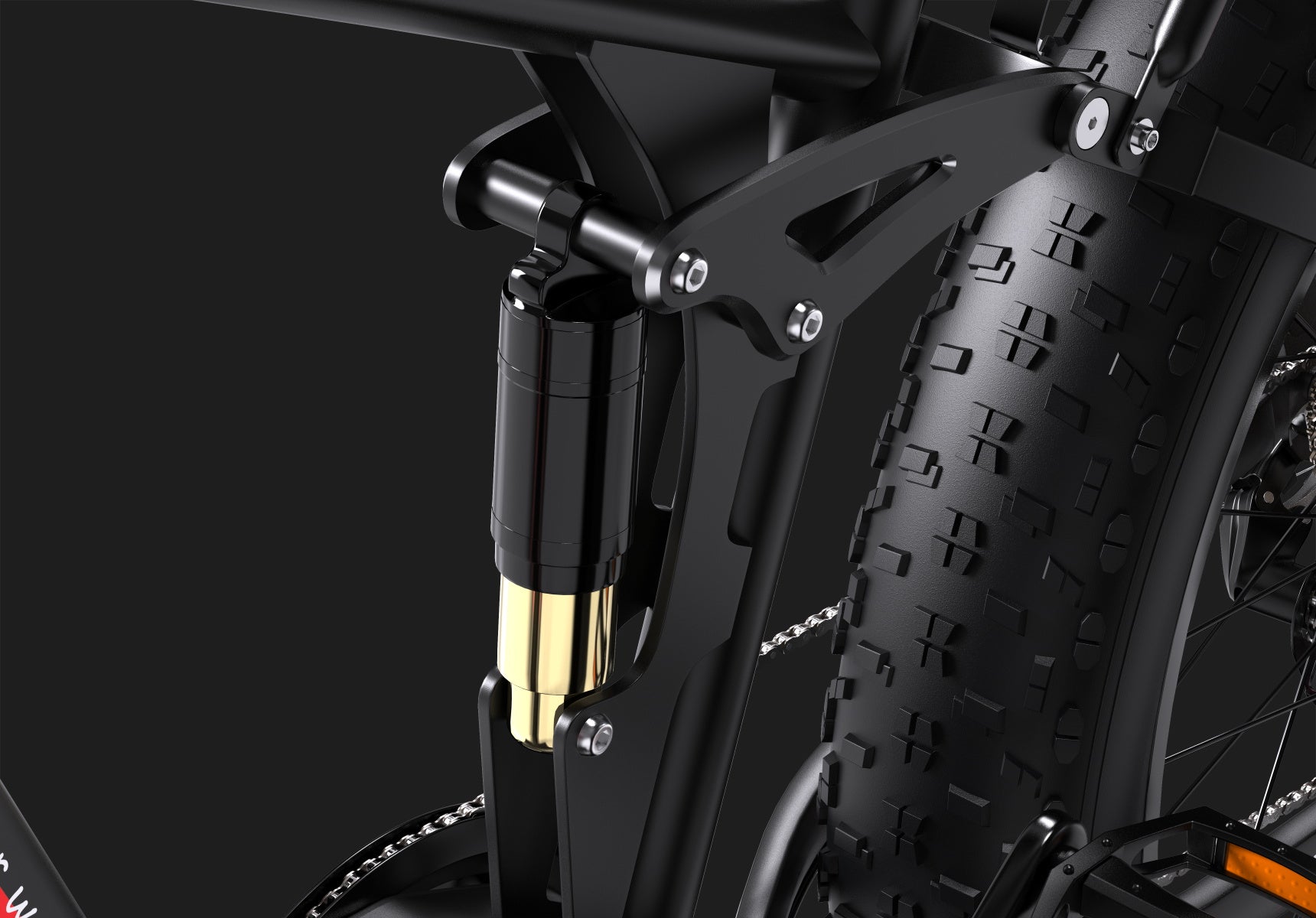 The front fork and rear shock absorber create a full suspension system. Designed for cycling challenges, it ensures smooth rides on rough terrains, enhances bike control, and reduces rider pressure. Easily navigate city streets, rocky trails, and unexpected bumps with confidence.