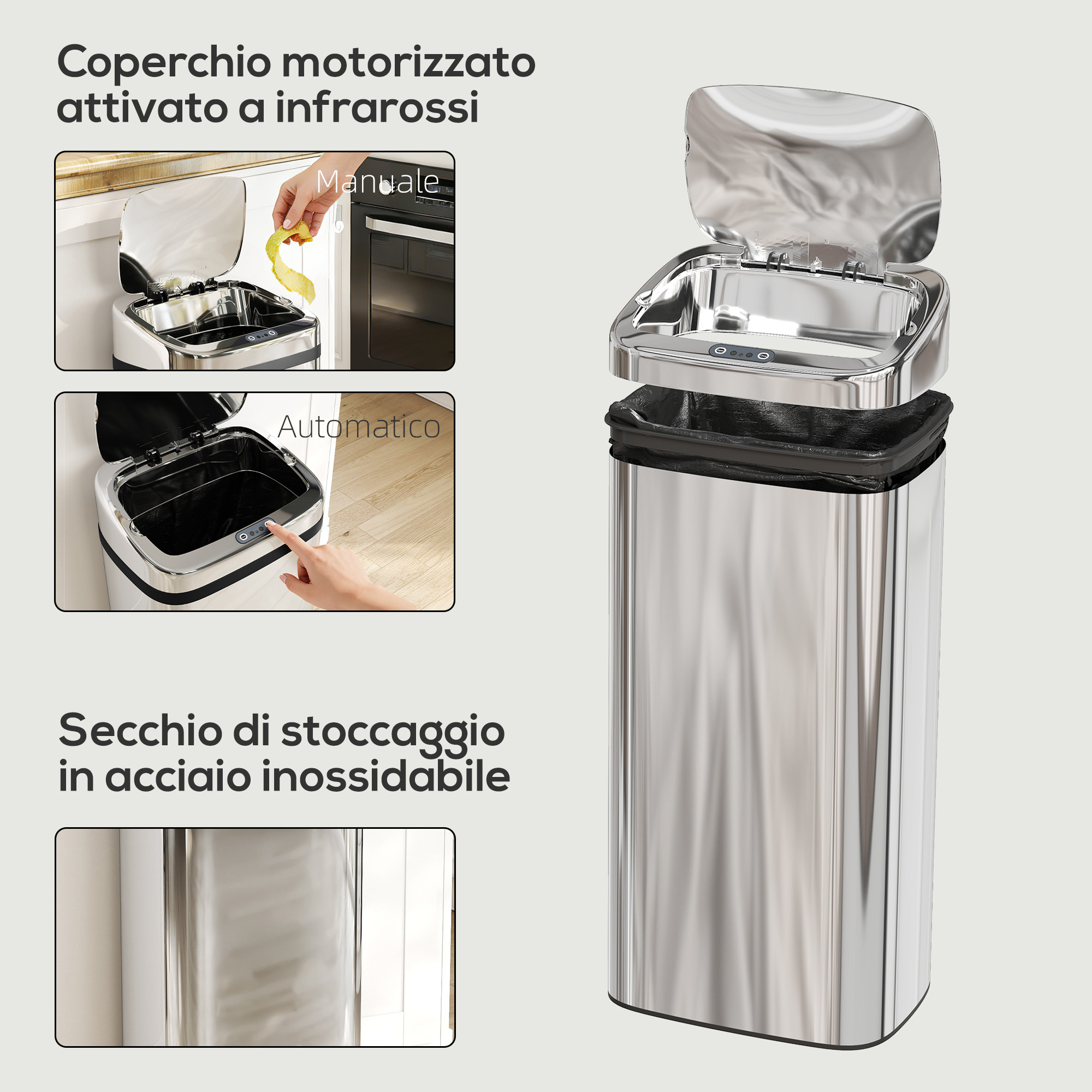 Bidone per Rifiuti da 40L con Sensore per Apertura e Chiusura Automatica, 33x25x70 cm, Argento