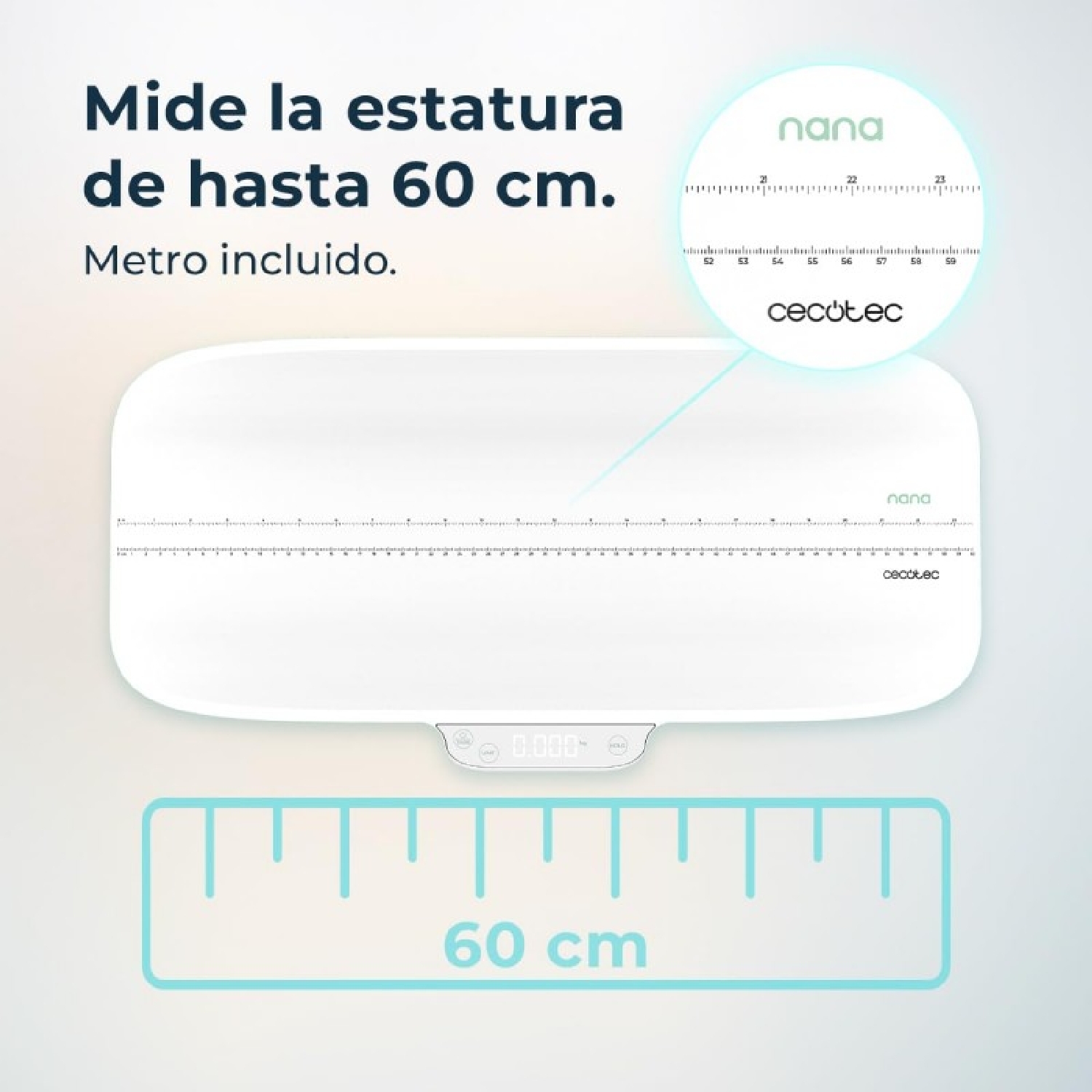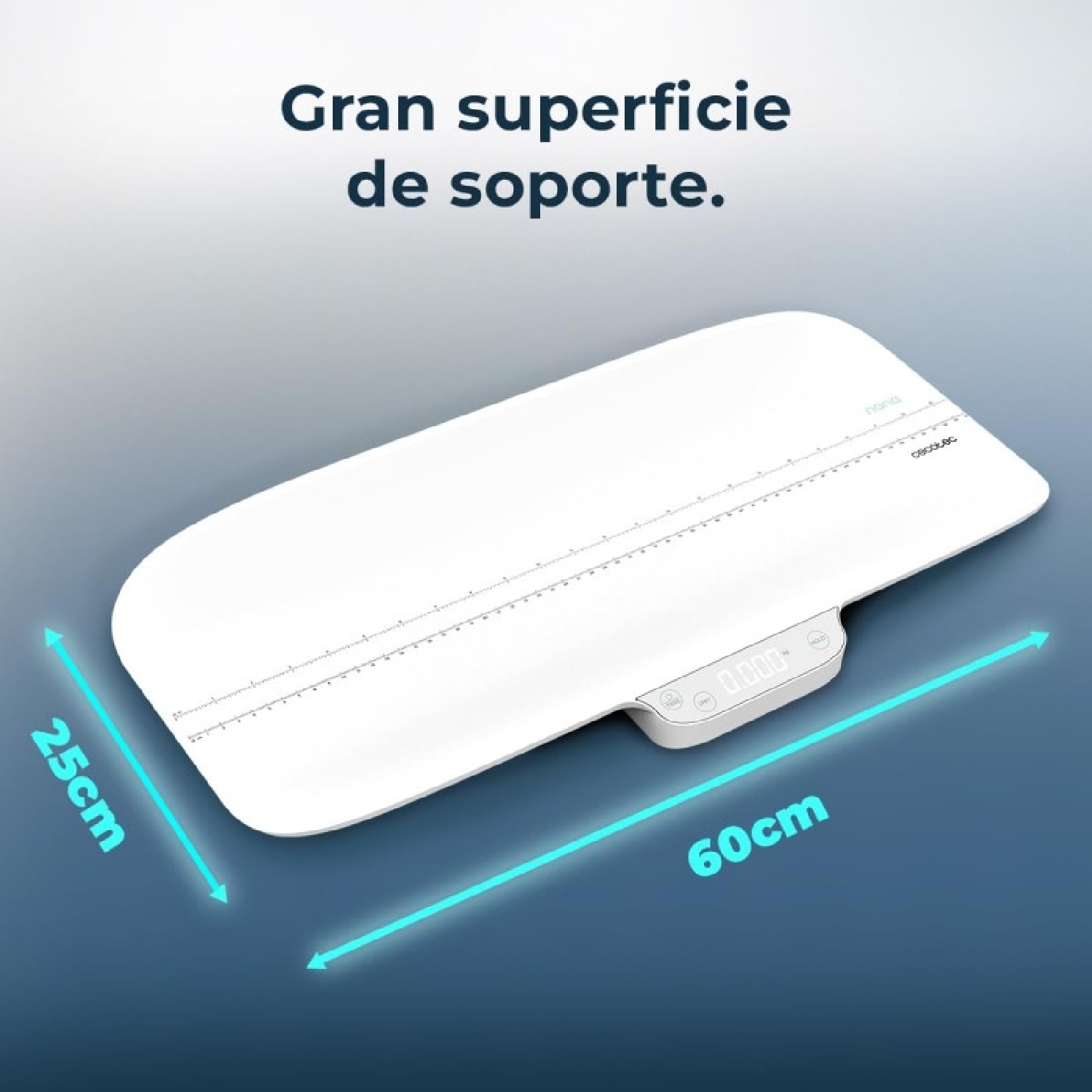 60 x 25 cm: la bilancia è dotata di un’ampia superficie d’appoggio su cui è possibile ottenere una misurazione accurata dell’altezza e del peso dei neonati.
