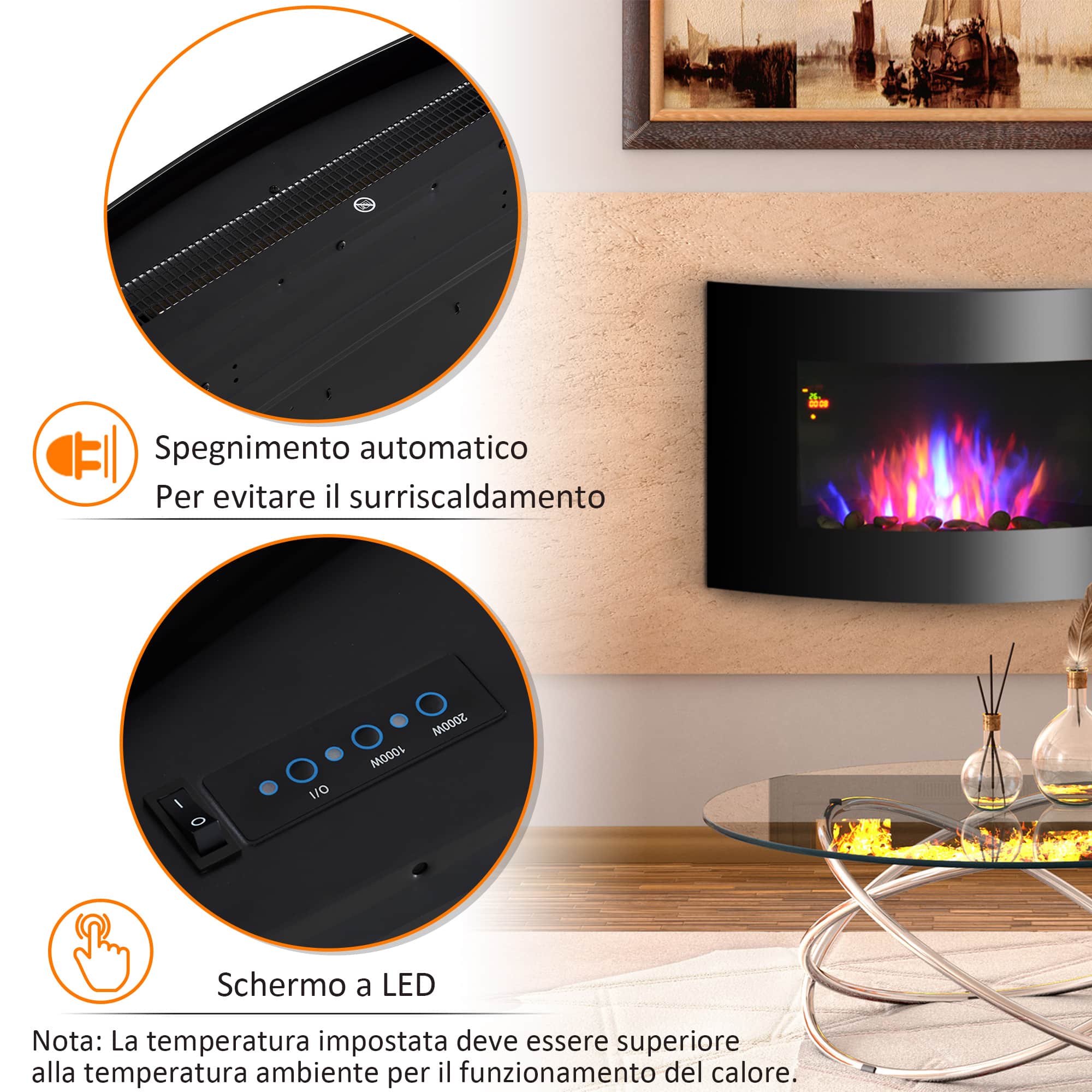 Il caminetto elettrico [ITALFROM HOME DESIGN] unisce l’effetto decorativo alla funzione di riscaldamento, Puoi usare l’effetto fiamma con 7 colori diversi insieme al riscaldamento o in modo indipendente, Il caminetto elettrico non produce cenere, odore e fumi ed è dotato di un sistema di sicurezza che evita il surriscaldamento,
