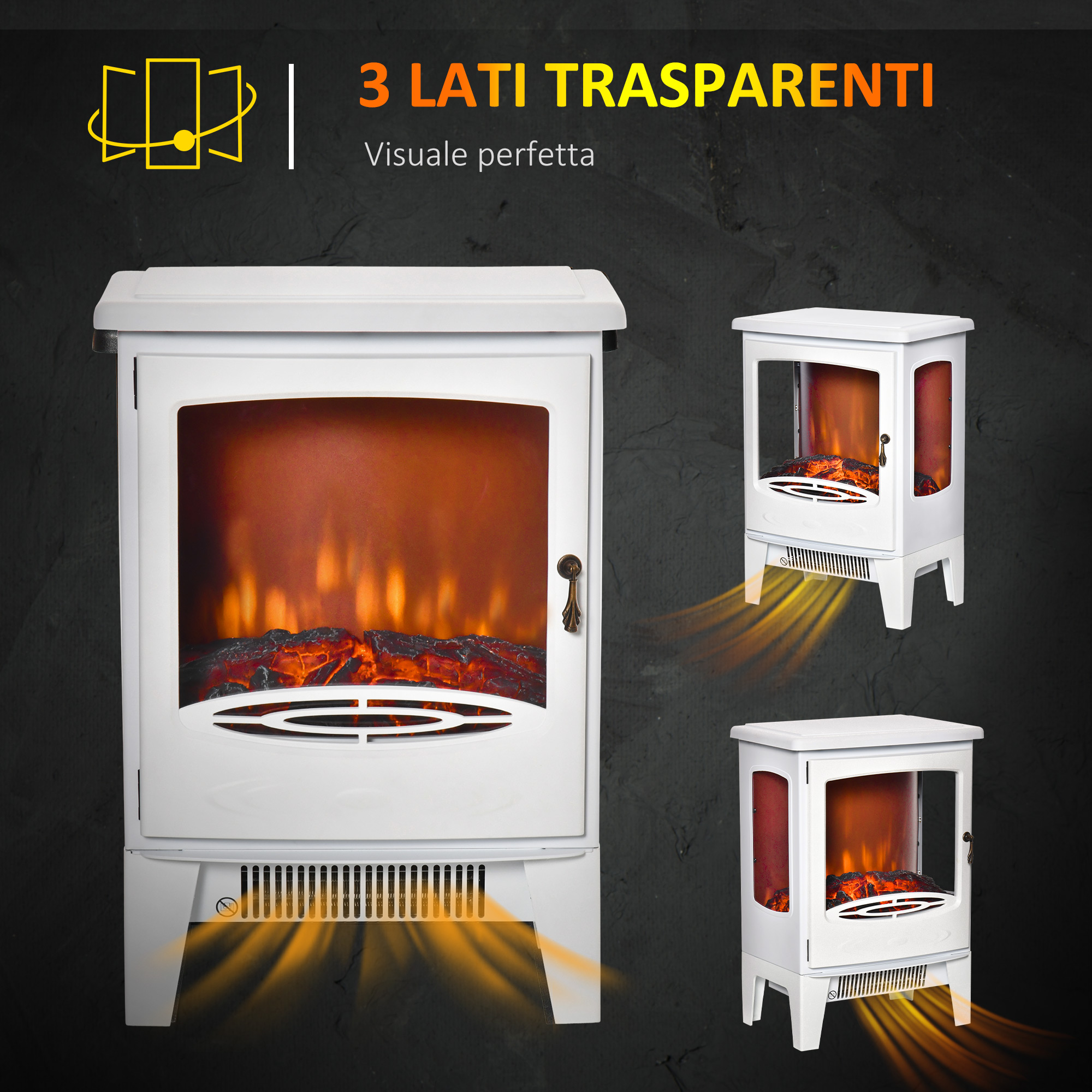 • • Caminetto elettrico indipendente con porta anteriore apribile e design trasparente su 3 lati per una migliore visione