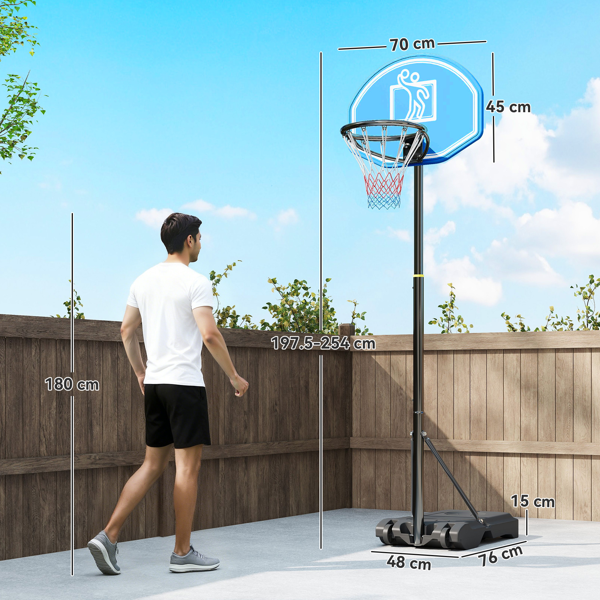 Canestro Basket con Altezza Regolabile 197,5-245cm, Base con Ruote e Tabellone, Blu