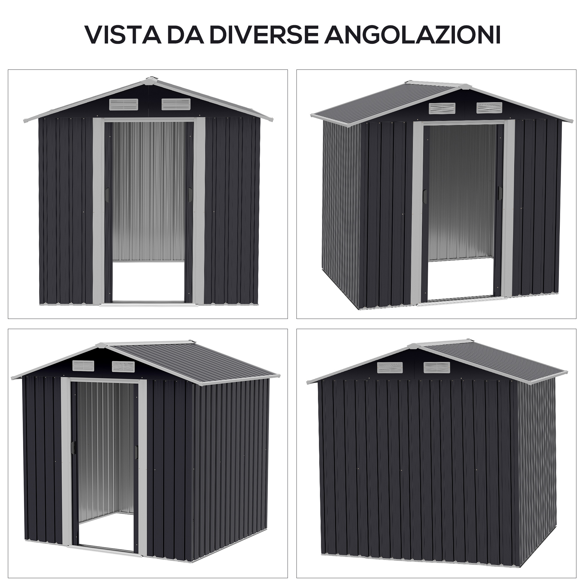 Conserva in tutta sicurezza i tuoi attrezzi da giardinaggio o accessori da esterno con questo capanno in metallo [ITALFROM HOME DESIGN], Realizzato in acciaio zincato per assicurare la resistenza, ha una doppia porta scorrevole e quattro prese d’aria per la ventilazione che prevengono la formazione di umidità, Il tetto inclinato evita gli accumuli e i ristagni d’acqua e la struttura è rifinita con un rivestimento protettivo contro gli agenti atmosferici, La sistemazione perfetta per tutti i tuoi attrezzi,