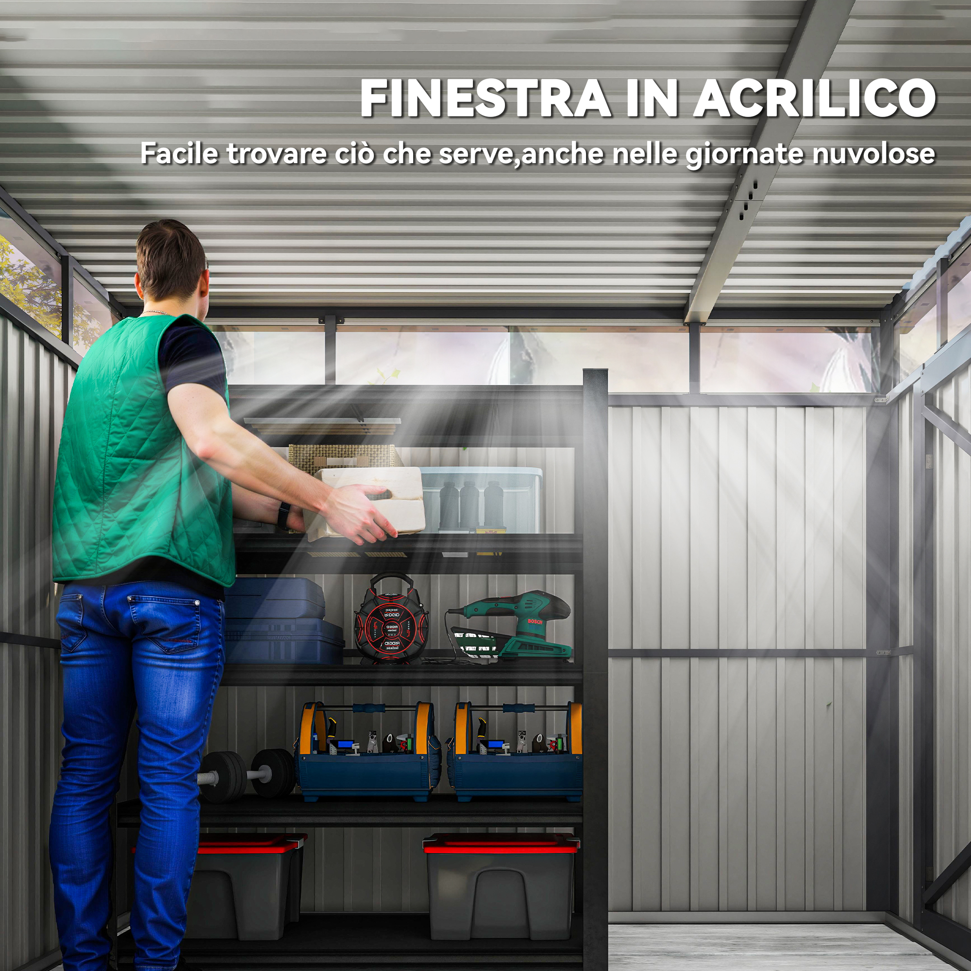 Non privarti della presenza di questo capanno da giardino [ITALFROM HOME DESIGN], l’alleato perfetto per organizzare gli spazi esterni! L’interno da 1,83×2,41 m offre ampio spazio per riporre attrezzi e accessori vari per uso esterno, La luce naturale riesce a entrare dal lucernario in acrilico, mentre la robusta struttura in acciaio zincato protegge dagli agenti atmosferici, assicurando sicurezza e robustezza al contenuto,