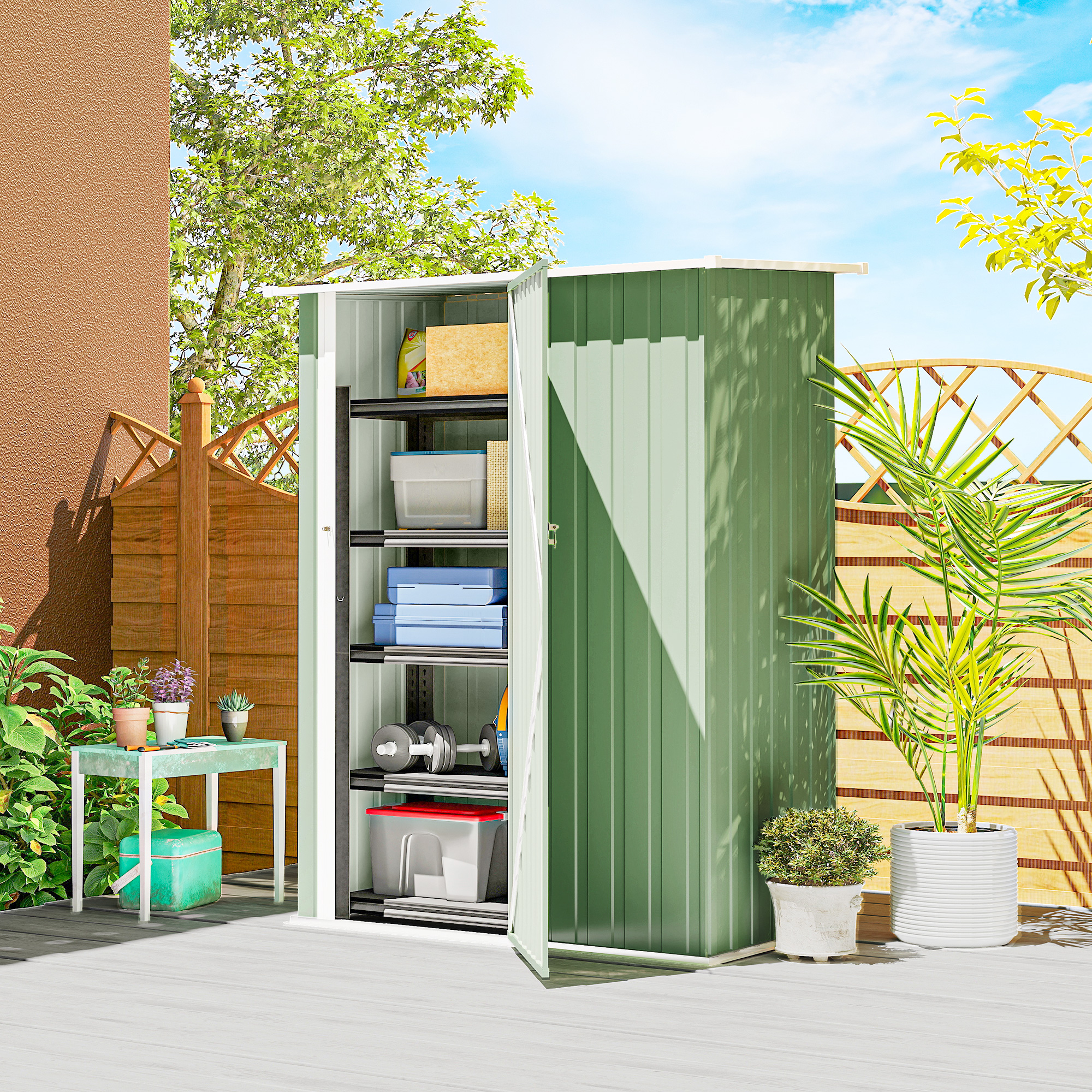 Capanno Porta Attrezzi in Metallo con Tetto Inclinato e Porta Bloccabile, 142x86x189 cm, Verde Chiaro
