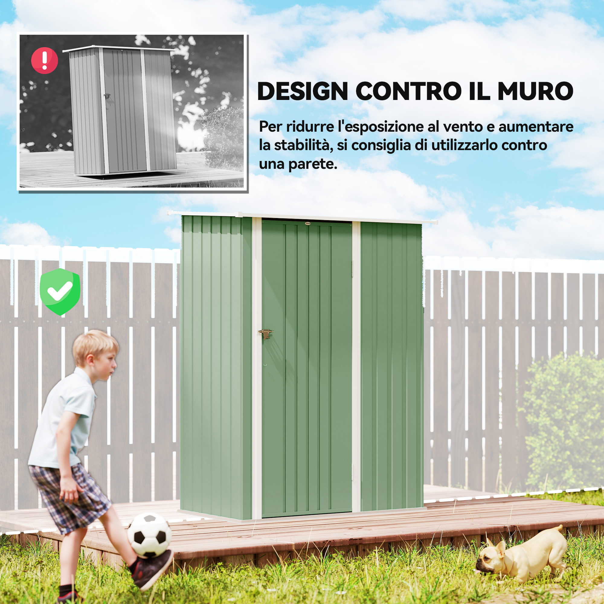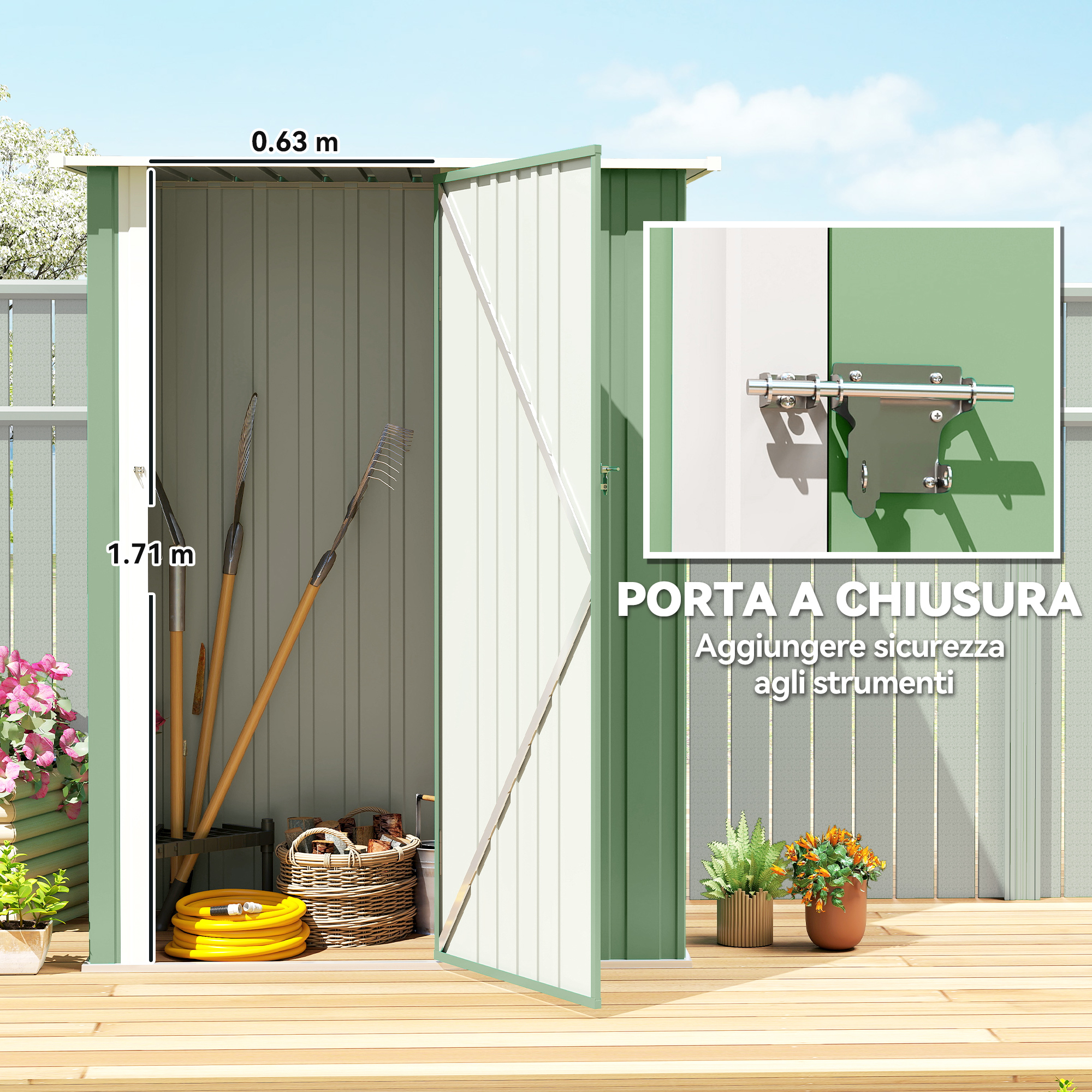 • • Capanno porta attrezzi dalla struttura in acciaio ondulato con rivestimento resistente alle intemperie, adatta per l’uso all’aperto