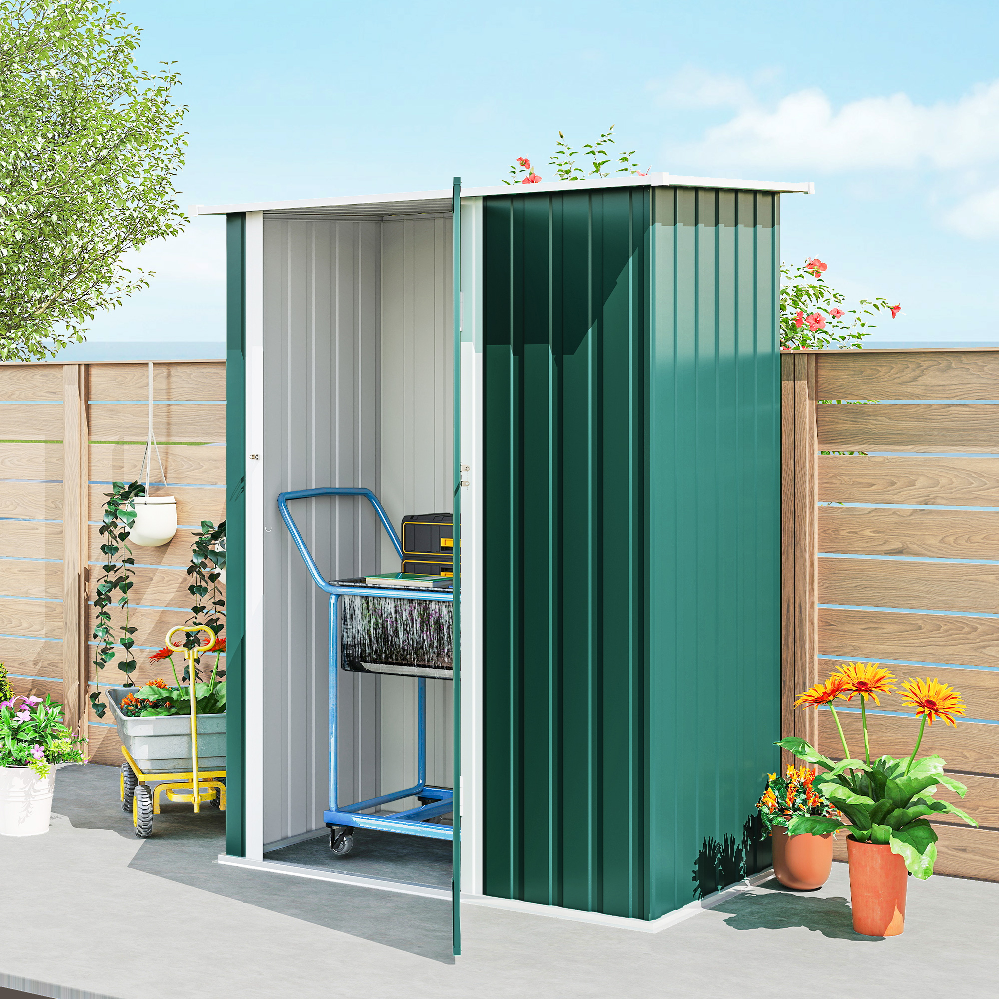 Capanno Porta Attrezzi in Metallo con Tetto Inclinato e Porta Bloccabile, 142x86x189 cm, Verde