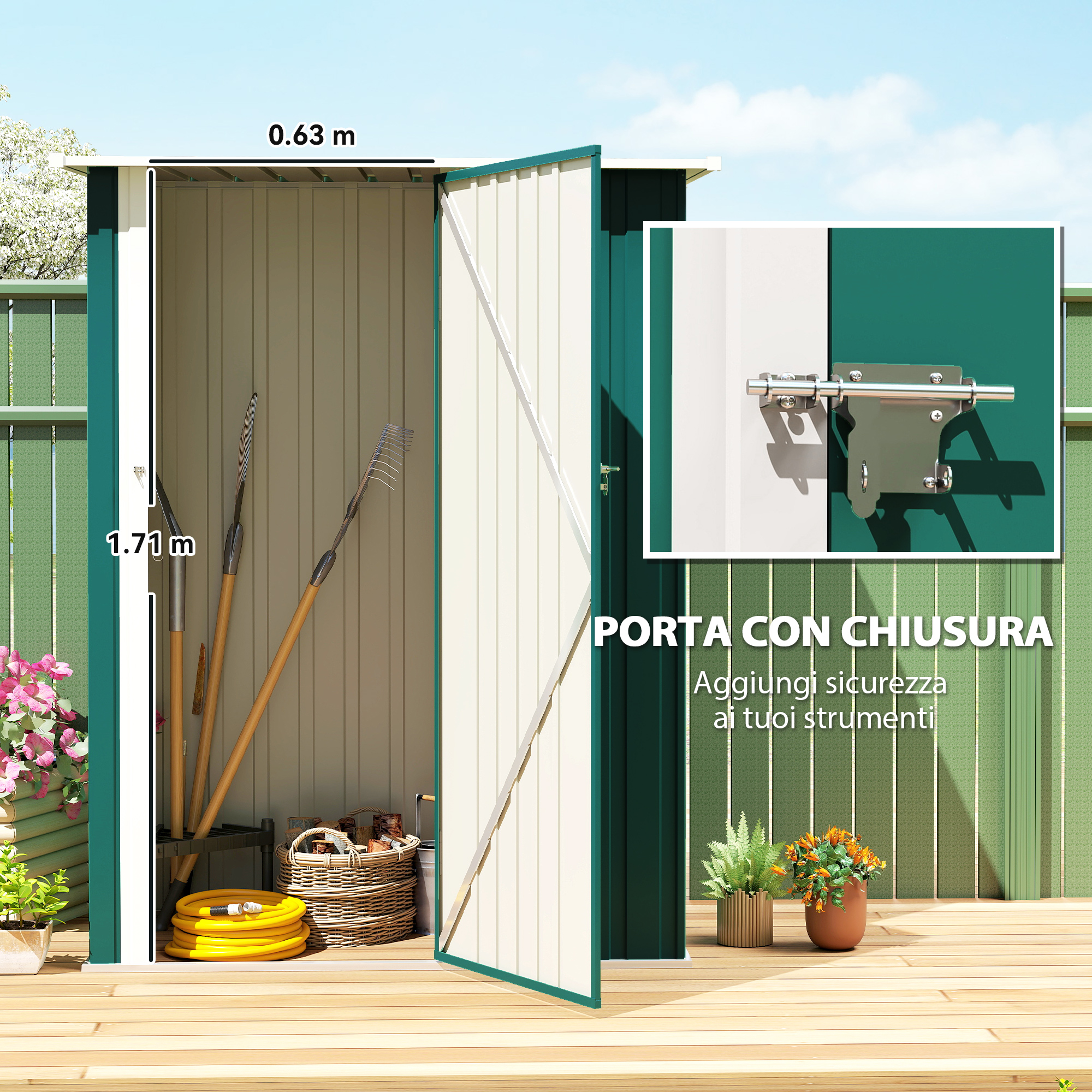 - • Capanno porta attrezzi dalla struttura in acciaio ondulato con rivestimento resistente alle intemperie, adatta per l’uso all’aperto
