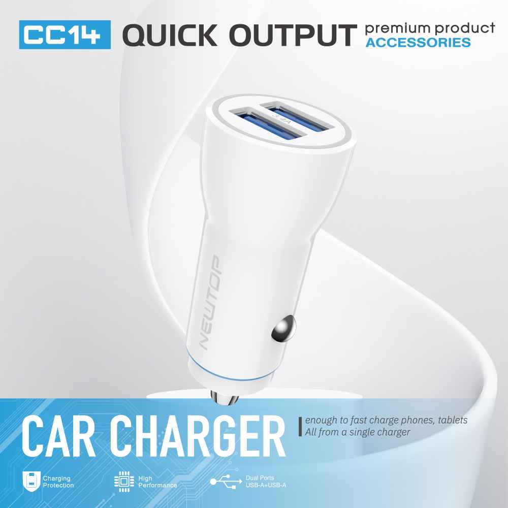 Caricatore Auto Newtop CC14 – 2 USB con Cavo Type-CCaricatore Auto Newtop CC14 con 2 Porte USB e Cavo Type-CIl caricatore da auto Newtop CC14 offre una ricarica veloce e affidabile con due porte USB, perfetto per caricare più dispositivi contemporaneamente durante i viaggi. Incluso cavo Type-C da 1 metro, compatibile con una vasta gamma di dispositivi.Caratteristiche Principali del Newtop CC14Input Power: DC 12-24V, compatibile con la maggior parte dei veicoli.Output Power: DC 5V / 3.4A max, per una ricarica simultanea ed efficiente.Due Porte USB: permettono di caricare smartphone, tablet o altri dispositivi elettronici.Design Compatto: facile da inserire nella presa accendisigari dell’auto.Specifiche Tecniche del Caricatore Auto CC14Caricatore USB con doppia porta, distribuzione ottimale della potenza per ricarica fino a 3.4A. Incluso cavo Type-C per connessione rapida ai dispositivi compatibili.Vantaggi del Caricatore Newtop CC14Ideale per chi cerca una soluzione versatile e completa, con la praticità del cavo Type-C incluso, per una ricarica rapida in viaggio.Domande FrequentiIl caricatore è compatibile con tutti i veicoli? Sì, supporta DC 12-24V, rendendolo adatto alla maggior parte delle auto.Il cavo Type-C è incluso? Sì, il prodotto viene fornito con un cavo Type-C da 1 metro per una ricarica veloce.