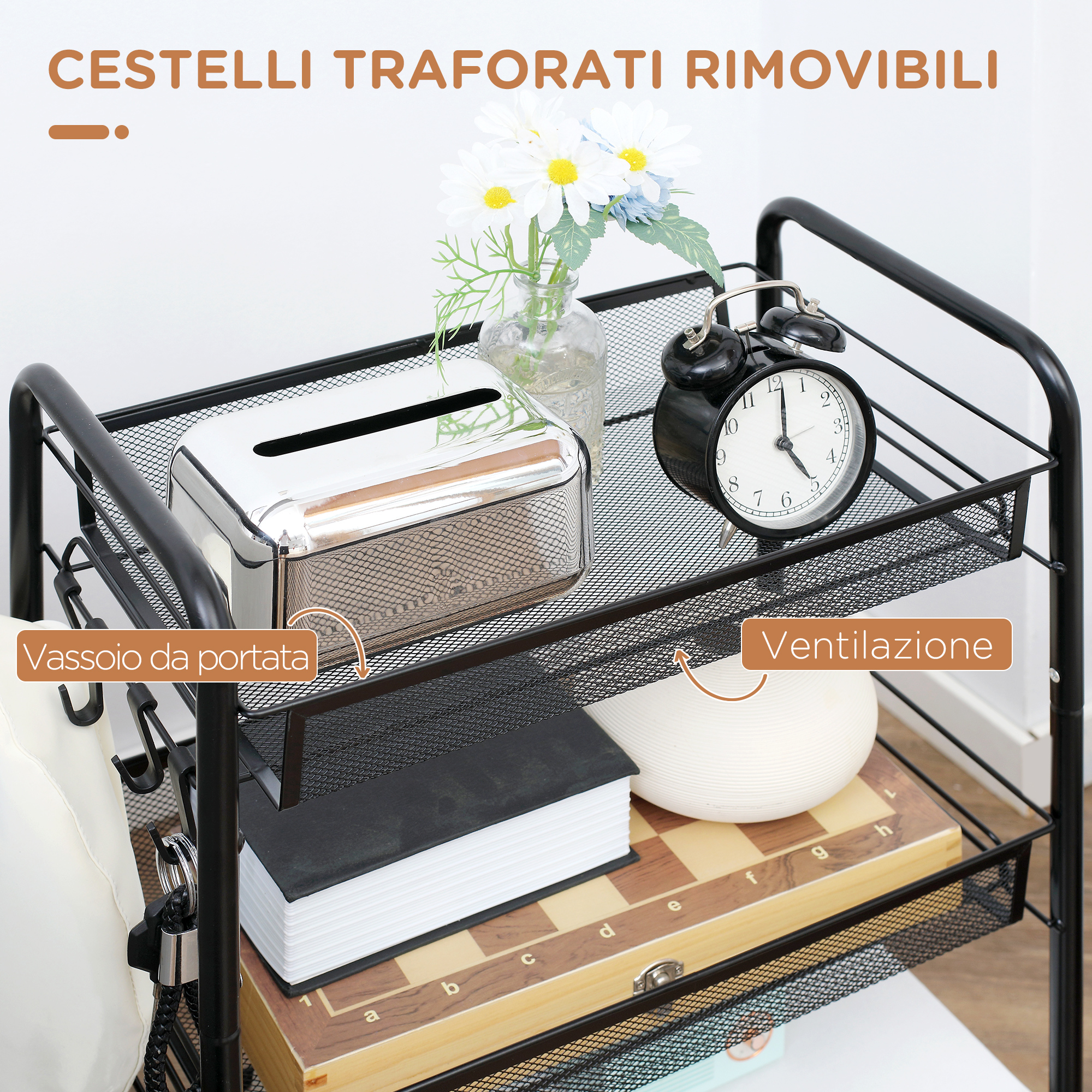 Carrello da Cucina a 3 Livelli con Cesti Removibili e 4 Ruote, in Acciaio e Plastica PP, 41.5Lx26.5×63 cm, Nero
