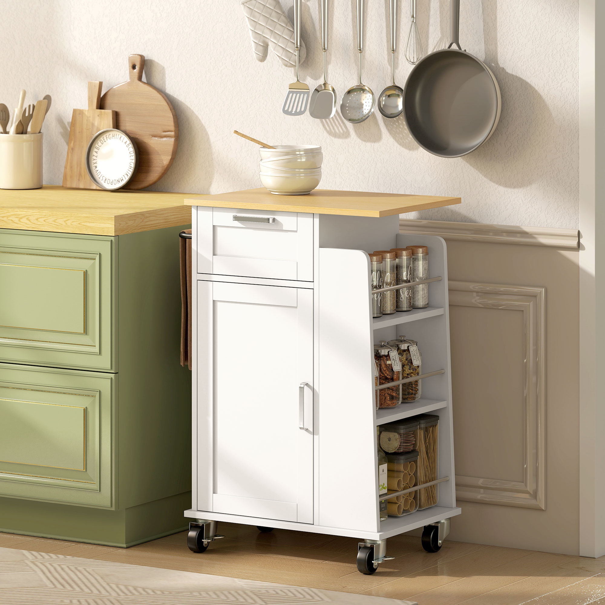 Carrello da Cucina con Cassetto, Armadietto, Portasciugamani e 3 Portaspezie, in Legno, 62x40x87 cm, Bianco