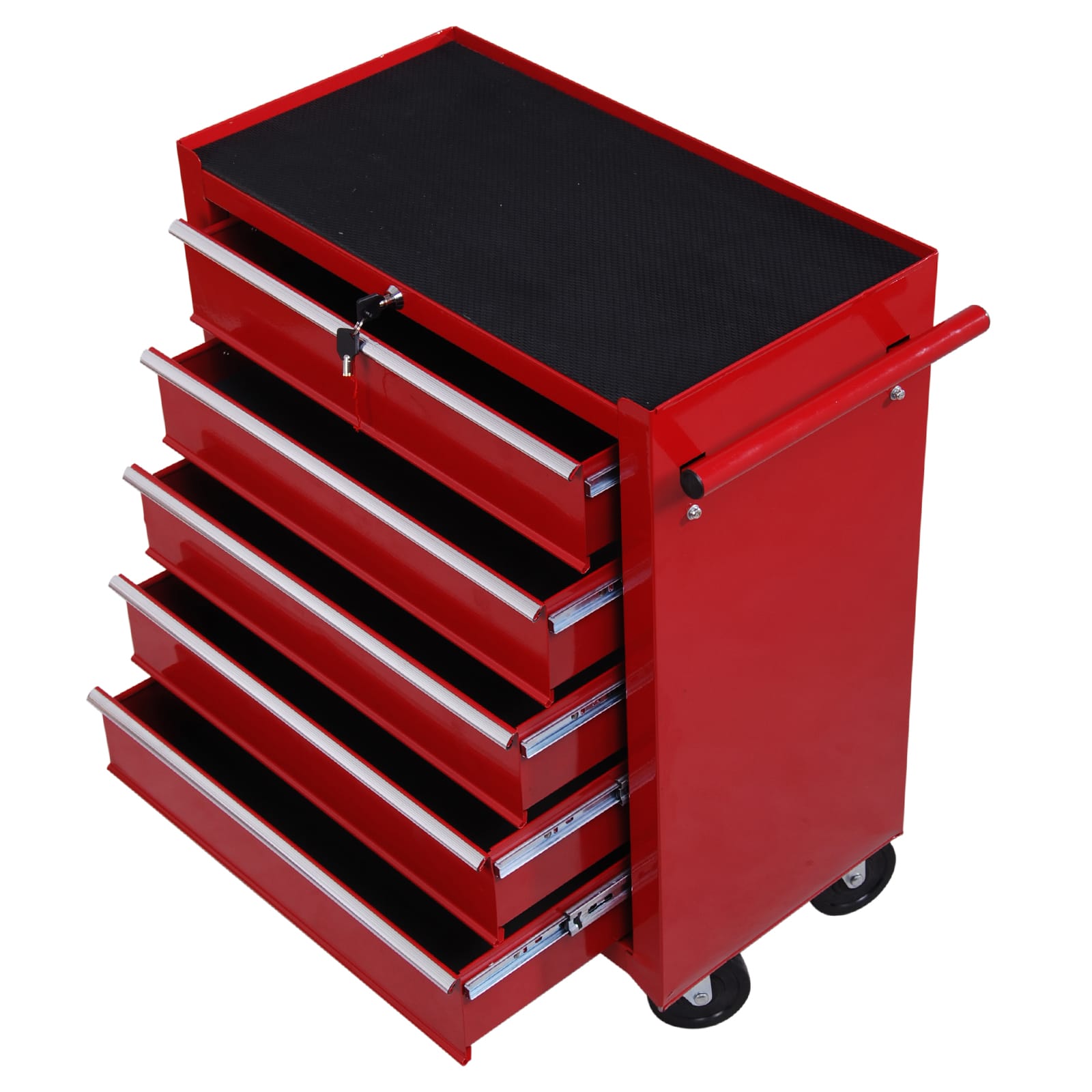 Carrello Porta Utensili con 5 Cassetti, Serratura, 2 Chiavi e Manubrio Parete Smontabile 2 Ruote con Freno in Lamiera d’Acciaio EVA Rosso 67,5x33x77cm