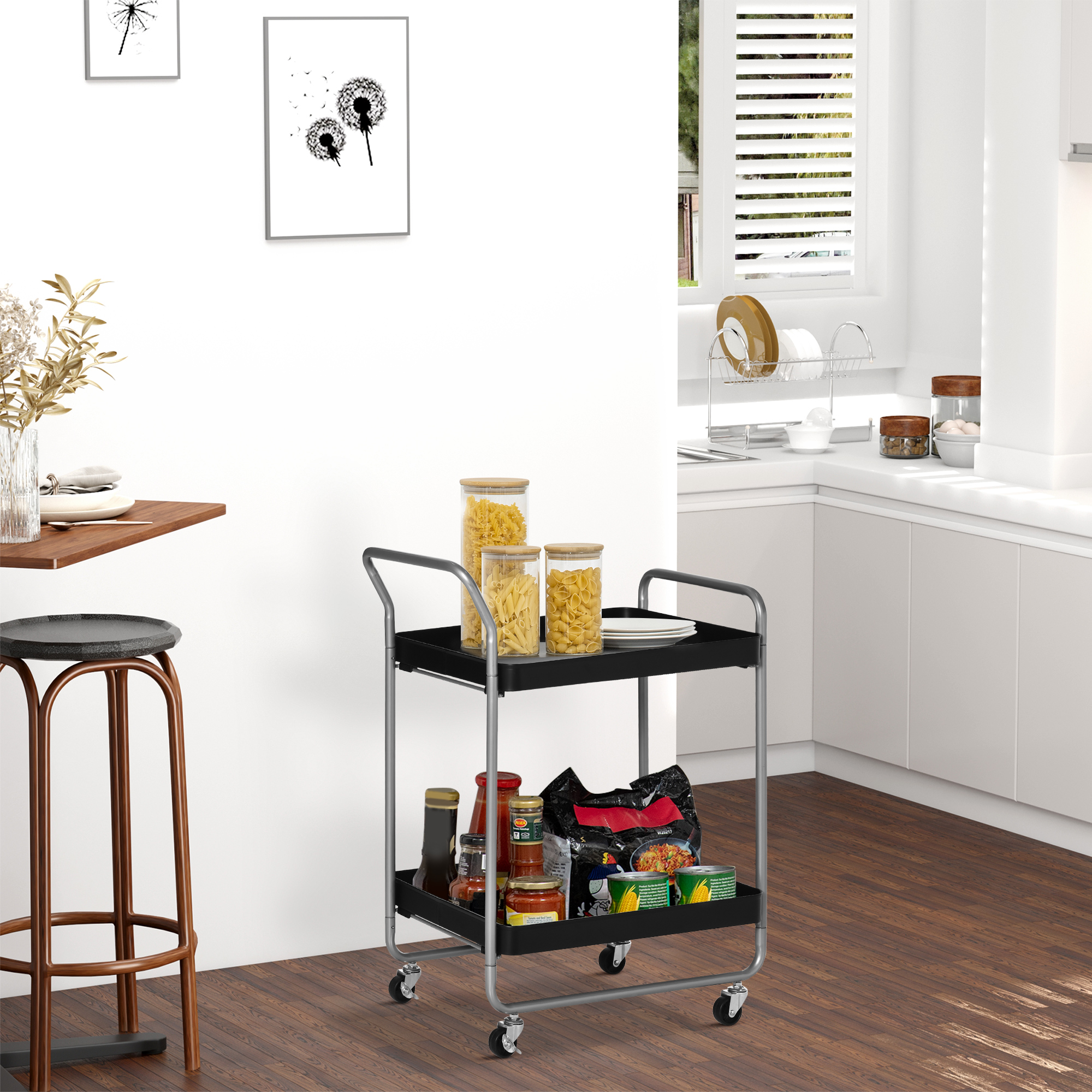 Carrello Portavivande a 2 Livelli con Maniglie e Ruote girevoli, Carrello Portaoggetti in Metallo per Cucina Soggiorno, 63×40,4×83,5cm, Nero