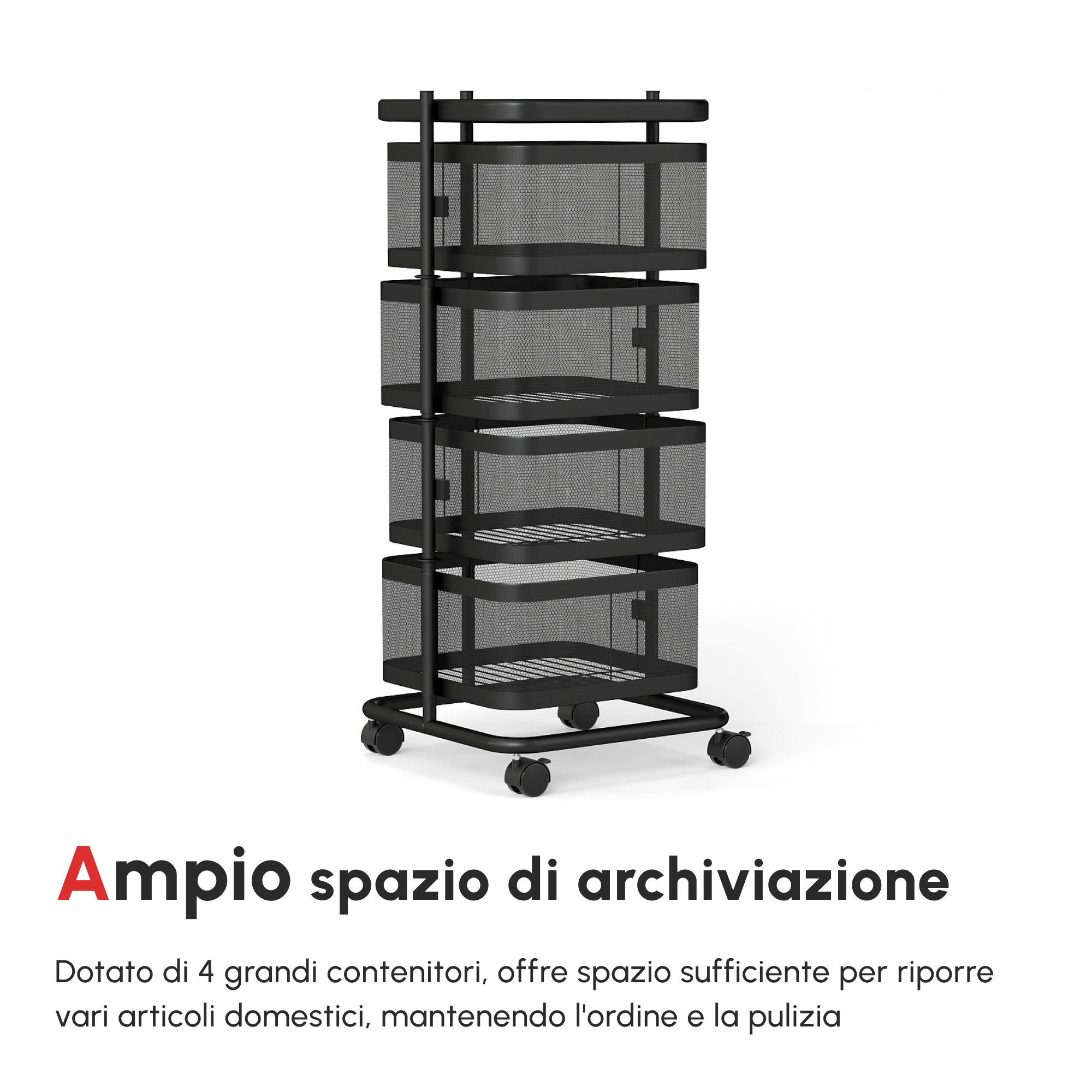 Questo carrello portavivande è l’ideale per raccogliere tanti oggetti in spazi ridotti, I 4 cestelli offrono ampio spazio per ogni accessorio, Grazie al design compatto e alle ruote flessibili, questo carrello per cucina può essere facilmente spostato da una stanza all’altra, Funziona bene come comodino per la camera da letto, carrello da cucina, carrello porta attrezzi e tanto altro ancora,
