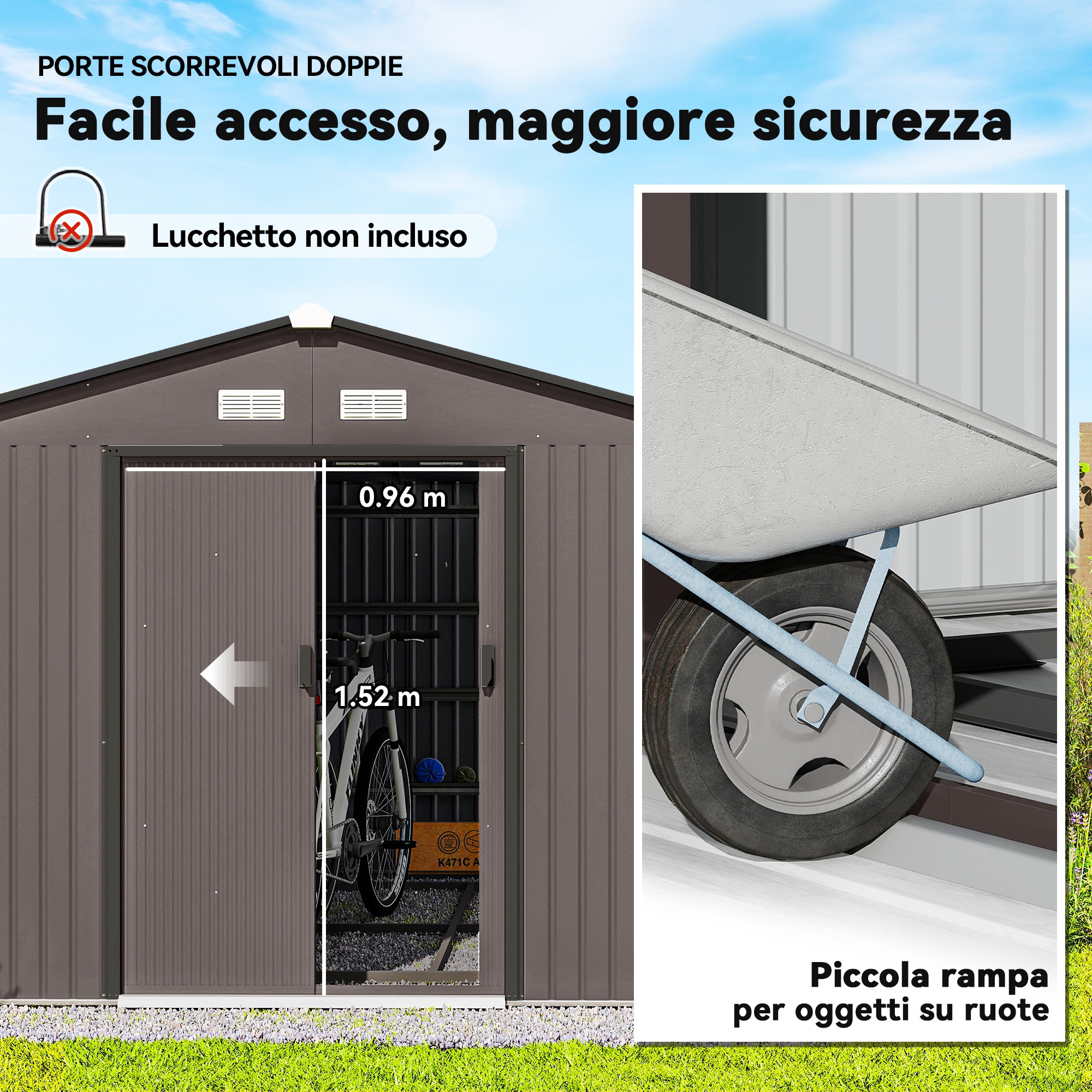 - • Casetta da giardino in lamiera con doppie porte scorrevoli per consentire un facile ingresso e accesso