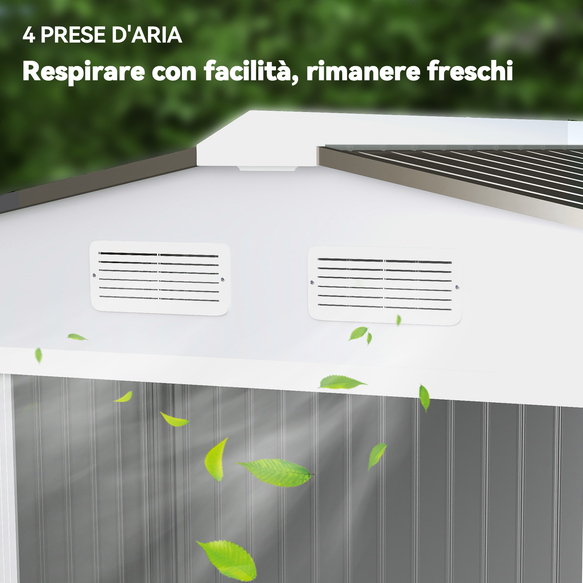 - • Casetta da giardino in lamiera con doppie porte scorrevoli per consentire un facile ingresso e accesso