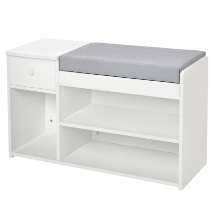 Panca Scarpiera con Cuscino, Cassetto e 3 Vani Aperti in Legno, 81×31,5x49cm, Bianco