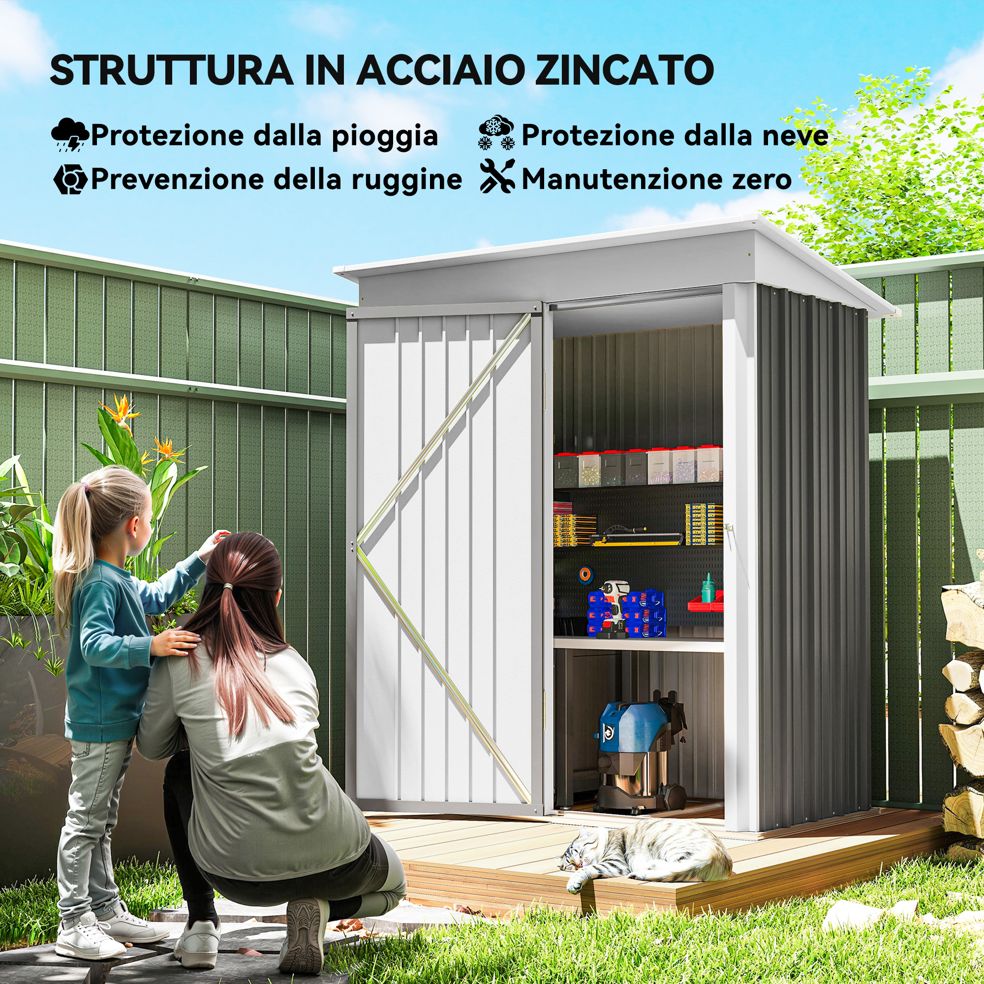 Riponi in modo ordinato tutti i tuoi attrezzi da giardino e arredi da esterno in questa piccola casetta [ITALFROM HOME DESIGN], La struttura in acciaio è resistente all’uso esterno e aiuta a mantenere tutti i tuoi oggetti al riparo dalle intemperie e dall’umidità, La porta è dotata di blocco, per tenere attrezzi e arredi al sicuro, Con questo armadio da esterno avere il giardino in ordine sarà più facile!