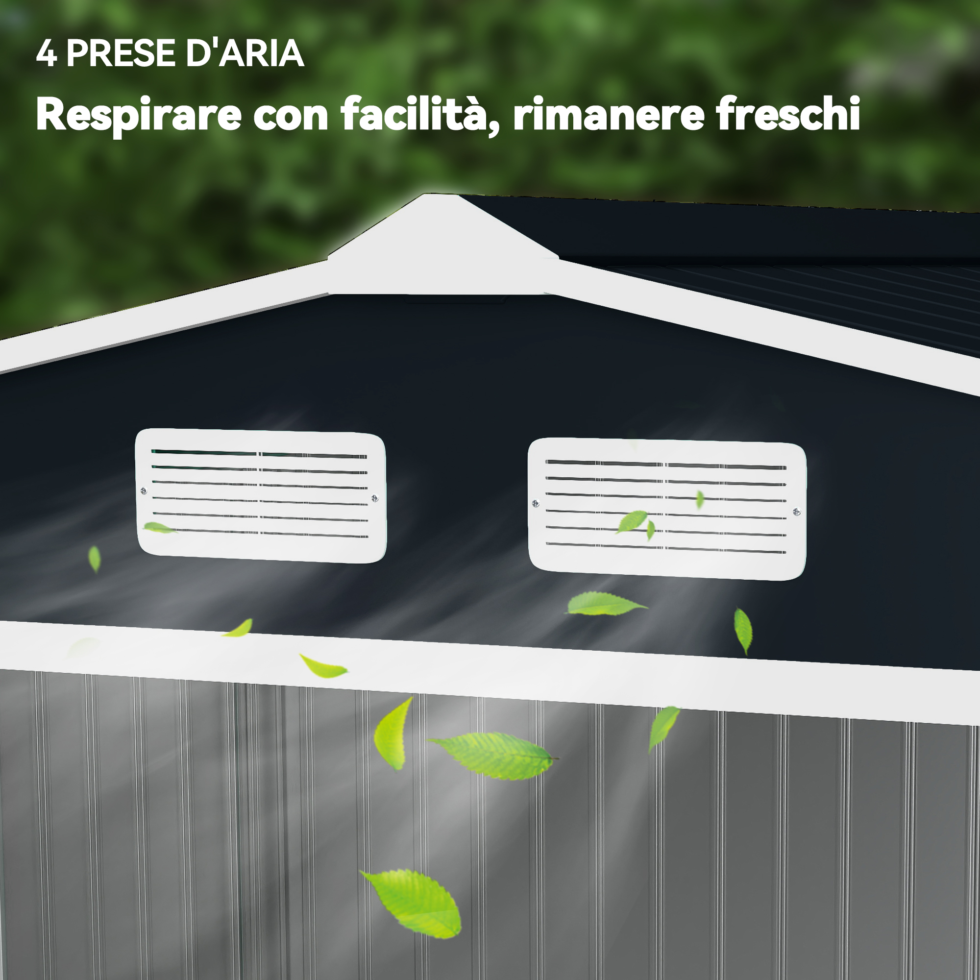 - • Casetta da giardino in lamiera con doppie porte scorrevoli per consentire un facile ingresso e accesso