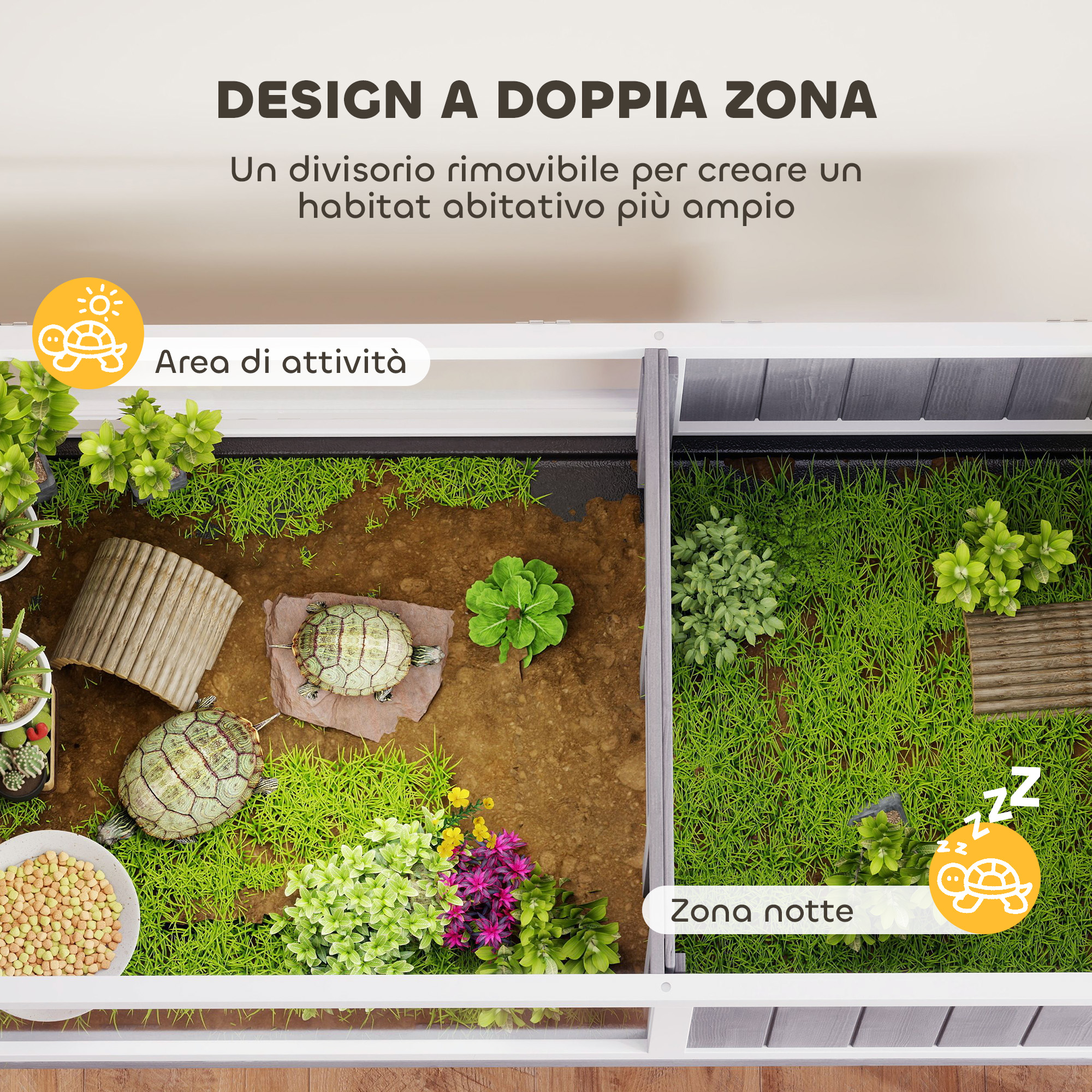 - • Il divisore rimovibile della tartarughiera crea una doppia zona o un habitat grande e personalizzabile