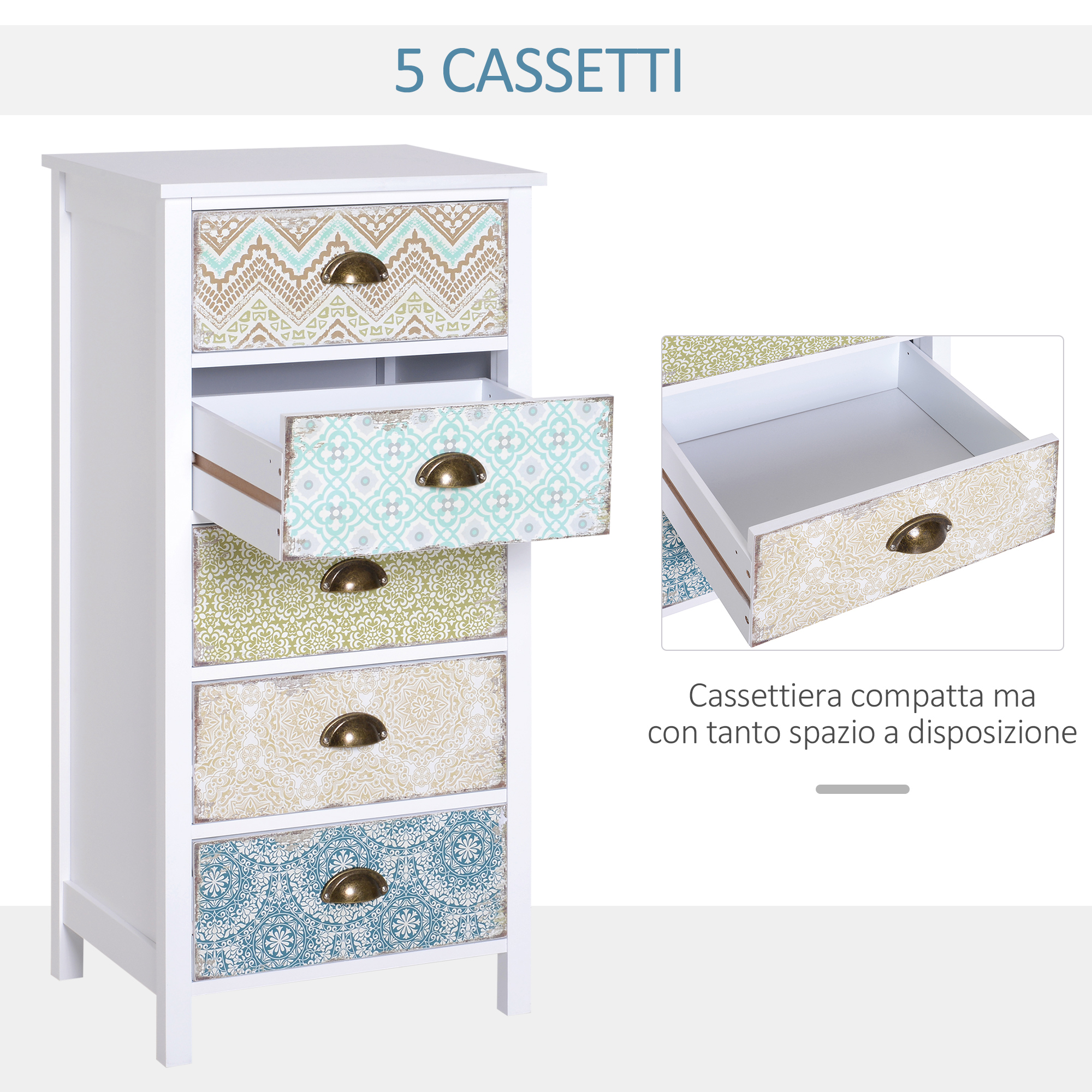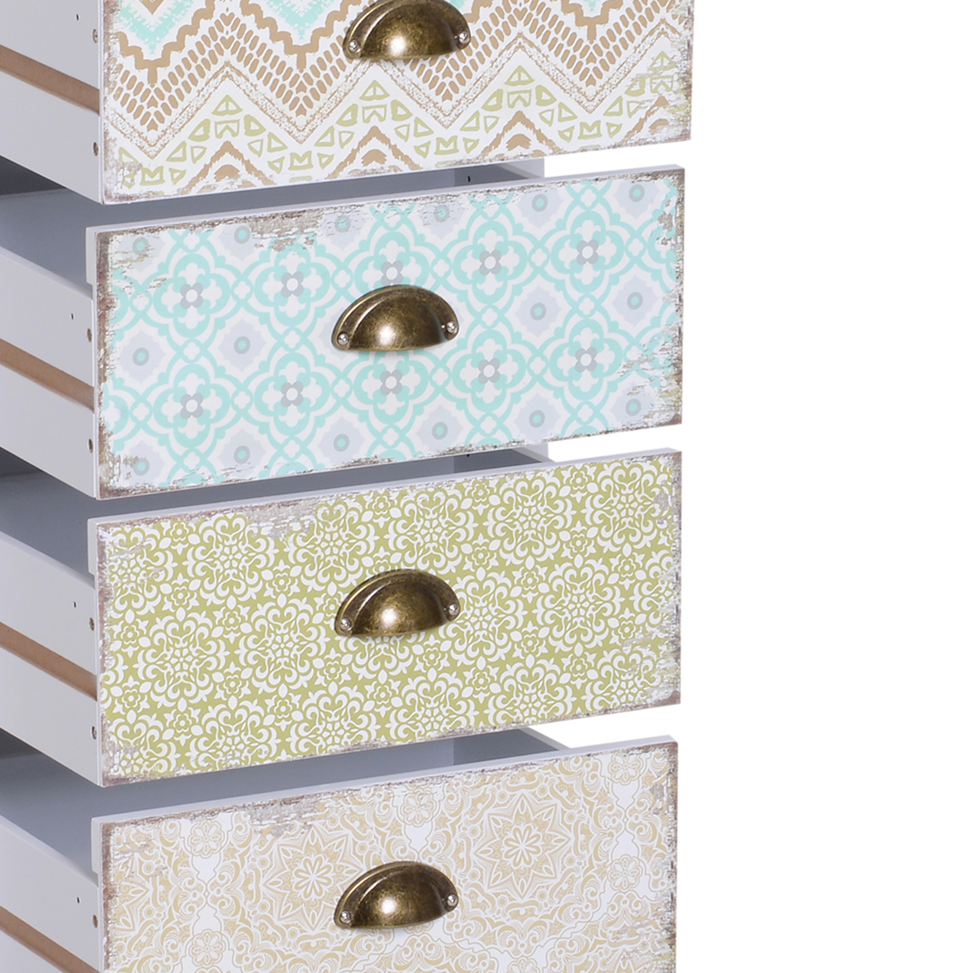 Mobiletto cassettiera in stile shabby, rappresenta una combinazione perfetta tra il moderno aspetto e l’alta funzionalità, Perfetto per qualunque ambiente della casa, per il soggiorno, ingresso, bagno o camera da letto, Dotato di 5 cassetti pratici con maniglie in metallo che facilitano le operazioni di chiusura e apertura, Offre sufficiente spazio per tenere in ordine gli oggetti, Realizzato in legno di elevata qualità e lavorato con attenzione anche ai minimi dettagli, Resistente e facile da pulire,