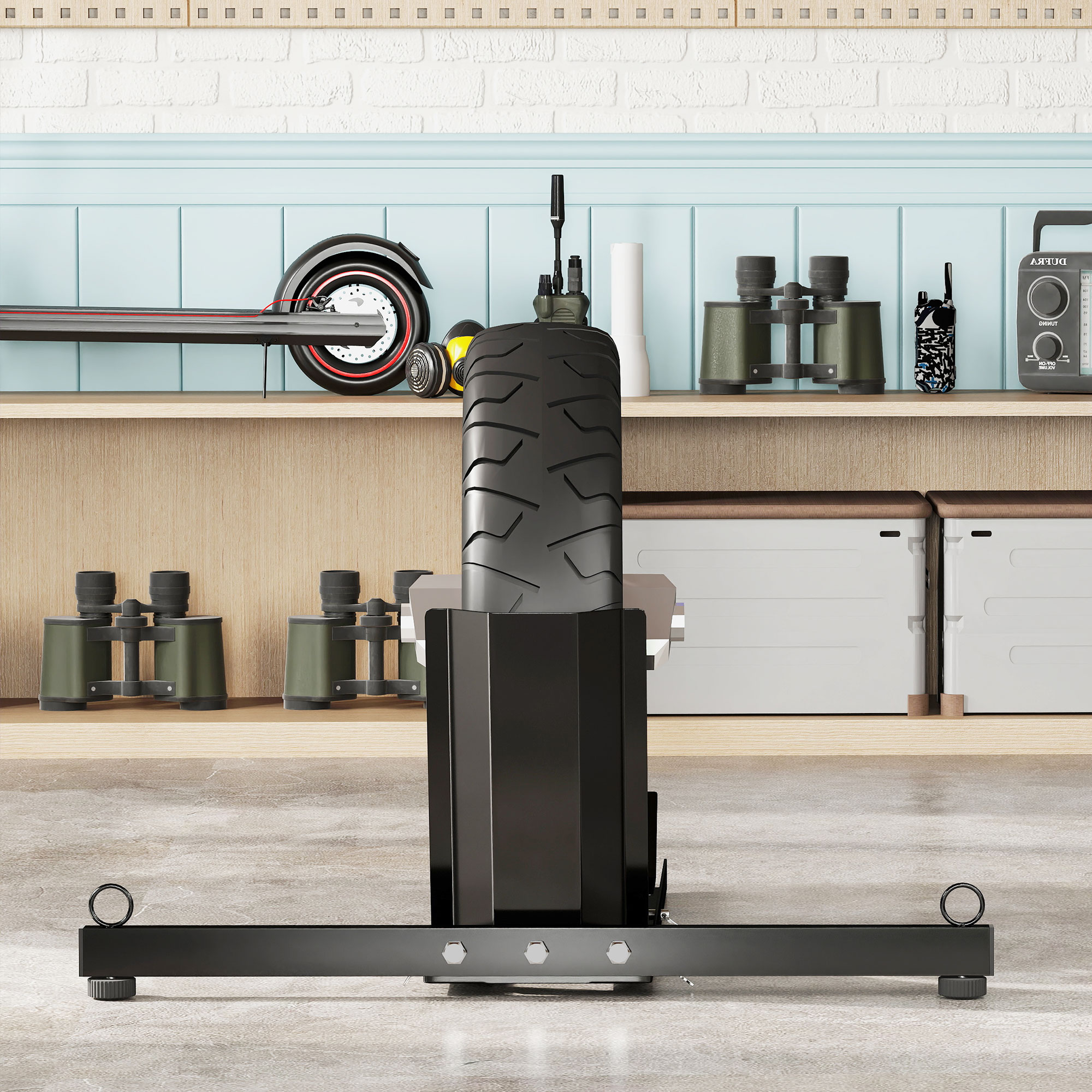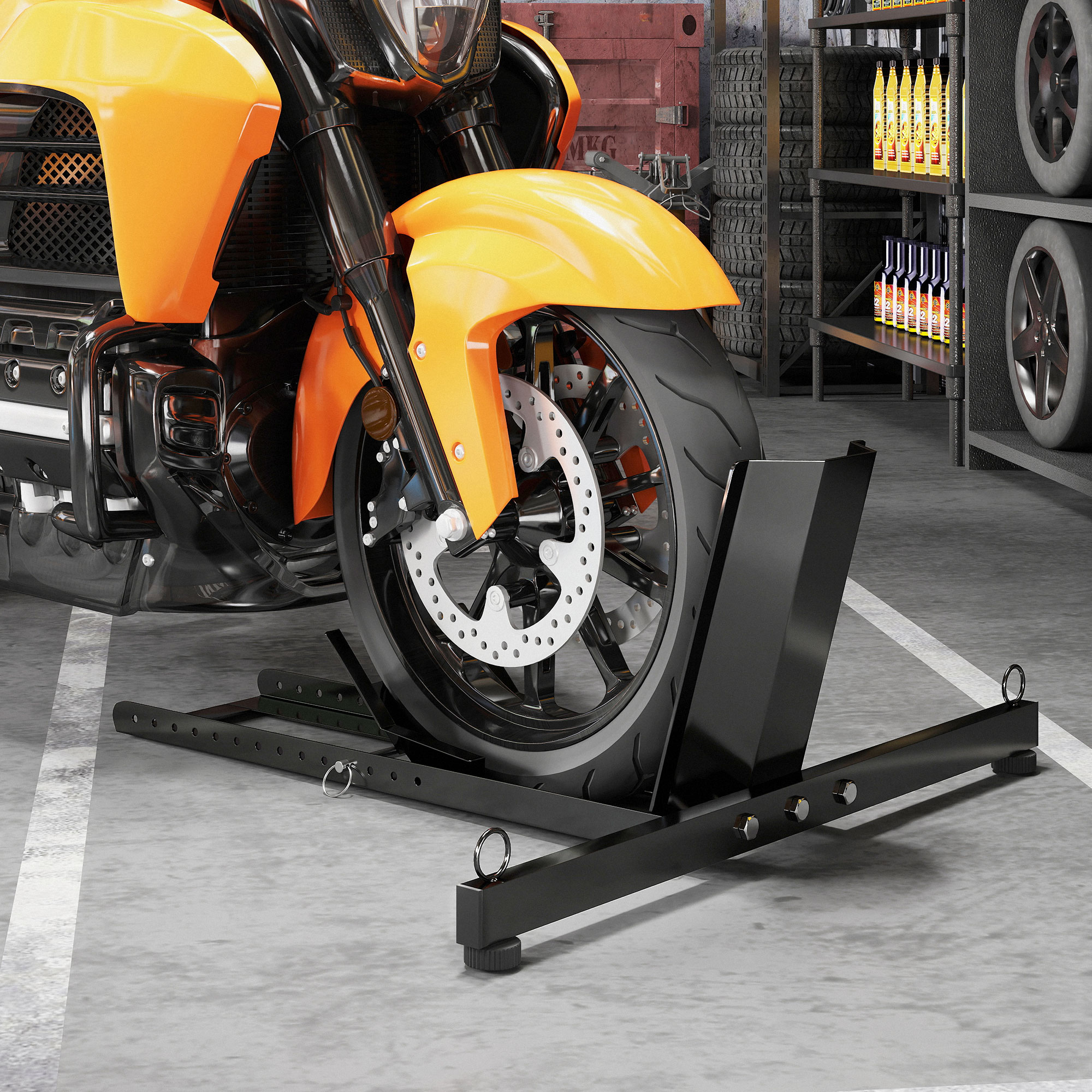 Potenzia la manutenzione della tua moto con il blocca ruota [ITALFROM HOME DESIGN], resistente, stabile e ad alta compatibilità, Adatto per ruote da Ø34 a Ø84 cm e da 6 a 16 cm di larghezza, questo cavalletto per moto regge fino a 816,5 kg grazie alla robusta struttura in acciaio verniciato a polvere, Perfetto per diverse necessità, può essere usato come elemento indipendente o fissato permanentemente a terra, Con anelli per cinghie incorporati, garantisce la massima sicurezza della tua moto in ogni situazione,