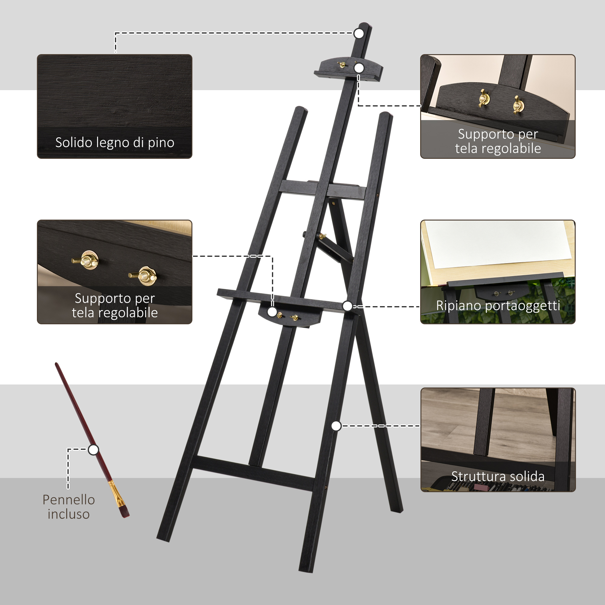 Cavalletto Pittura, 135 cm Cavalletto Treppiede per Dipingere su Tela, Cavalletto in Legno di Pino Regolabile, Portatile e Pieghevole con Pennello per Studio, Artisti e Pittori, Nero