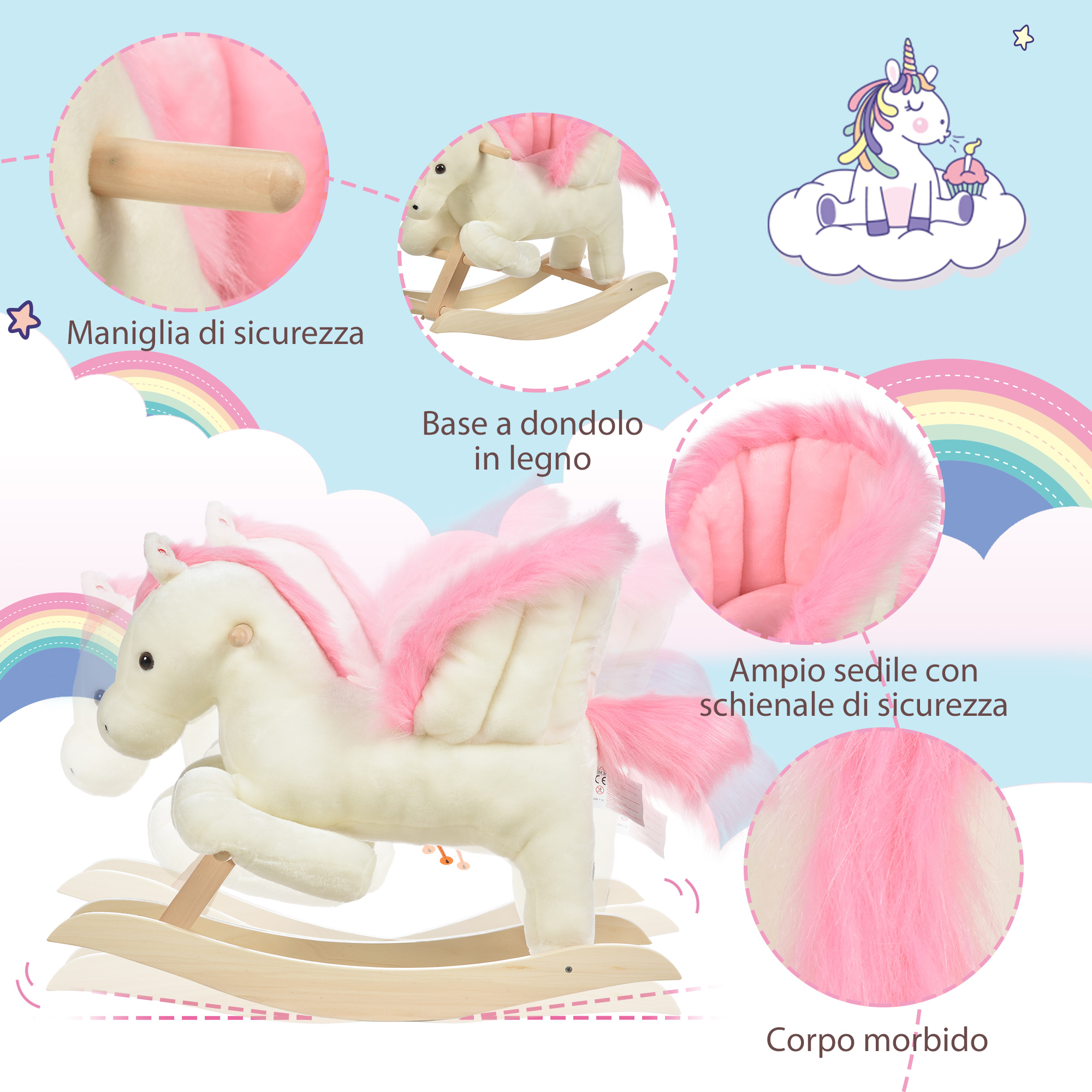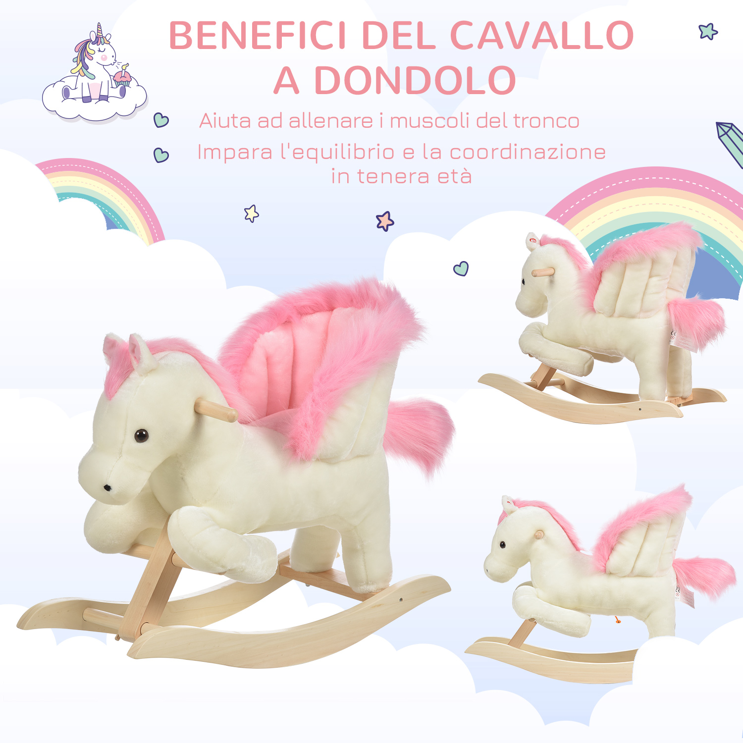 Cavallo a Dondolo Bianco e Rosa con Suoni e Struttura in Legno di Pioppo per Bambini 18-36 Mesi, 70x28x57cm