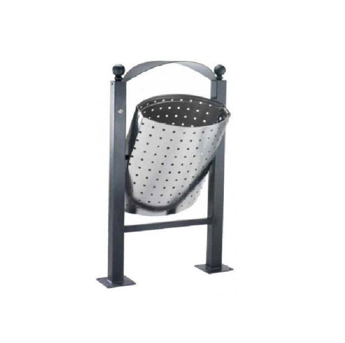 Cestino con contenitore elittico da 50×58 h cm in lamiera forata d�acciaio sp. 2 mm o acciaio inox AISI 304 con fori quadri da 6 mm, completo di anello reggi sacco in acciaio inox.