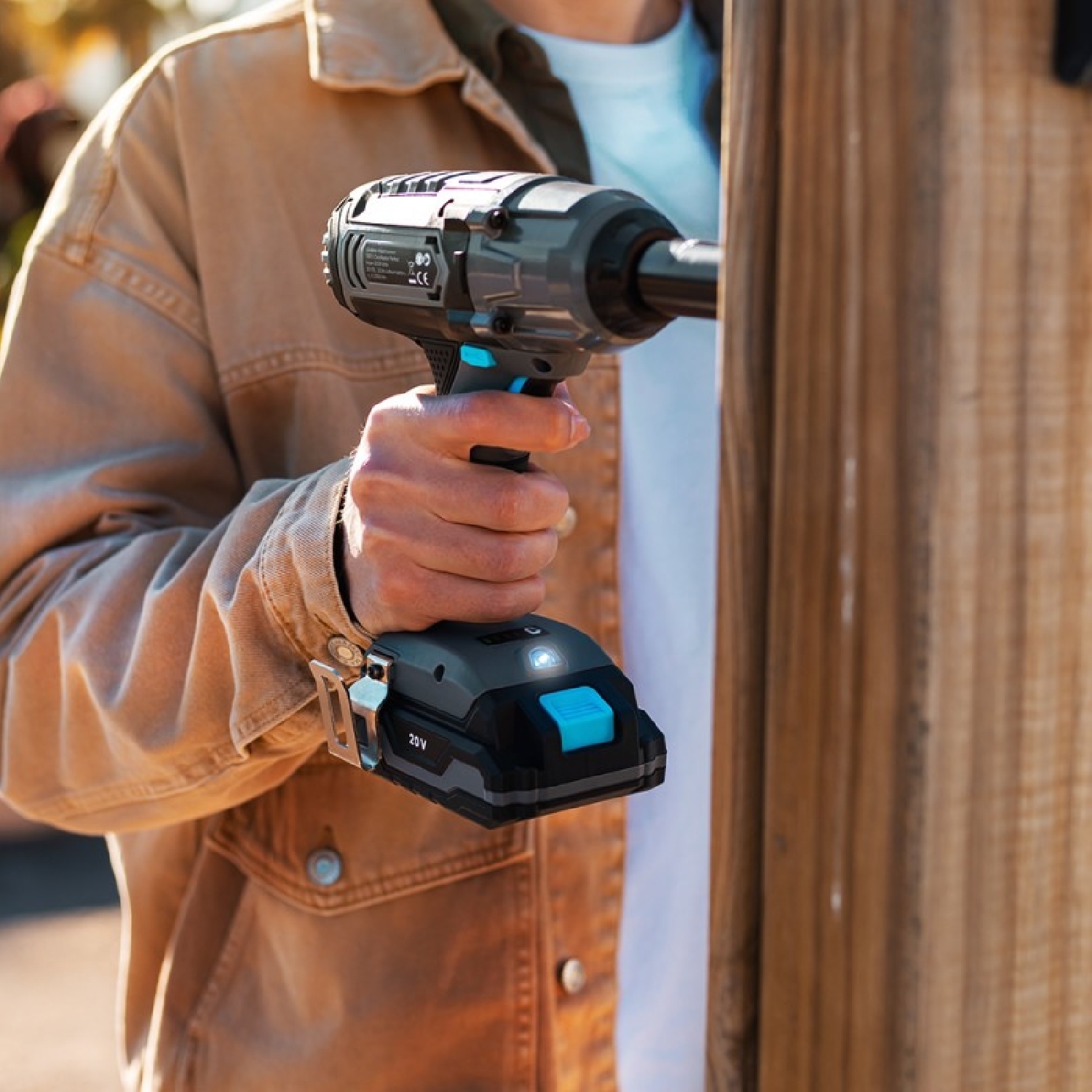 Chiave a impatto da 20 V, 2.000mAh, velocità a vuoto di 2.300 giri/min, un tasso di impatto di 3.000 bpm, coppia massima di 400 Nm con 4 posizioni, luce di lavoro e autonomia fino a 20 min.