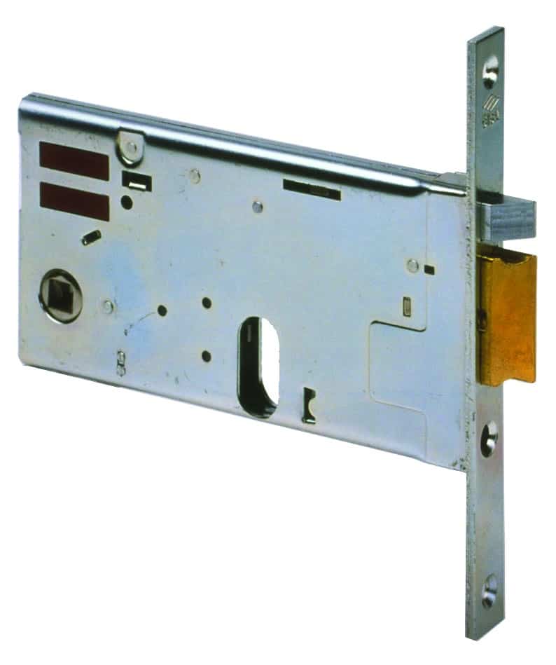 Elettroserratura da infilare per fasce. Scrocco autobloccante, fermo a giorno, zincata, scatola mm. 137×77, tensione 12 V ca.