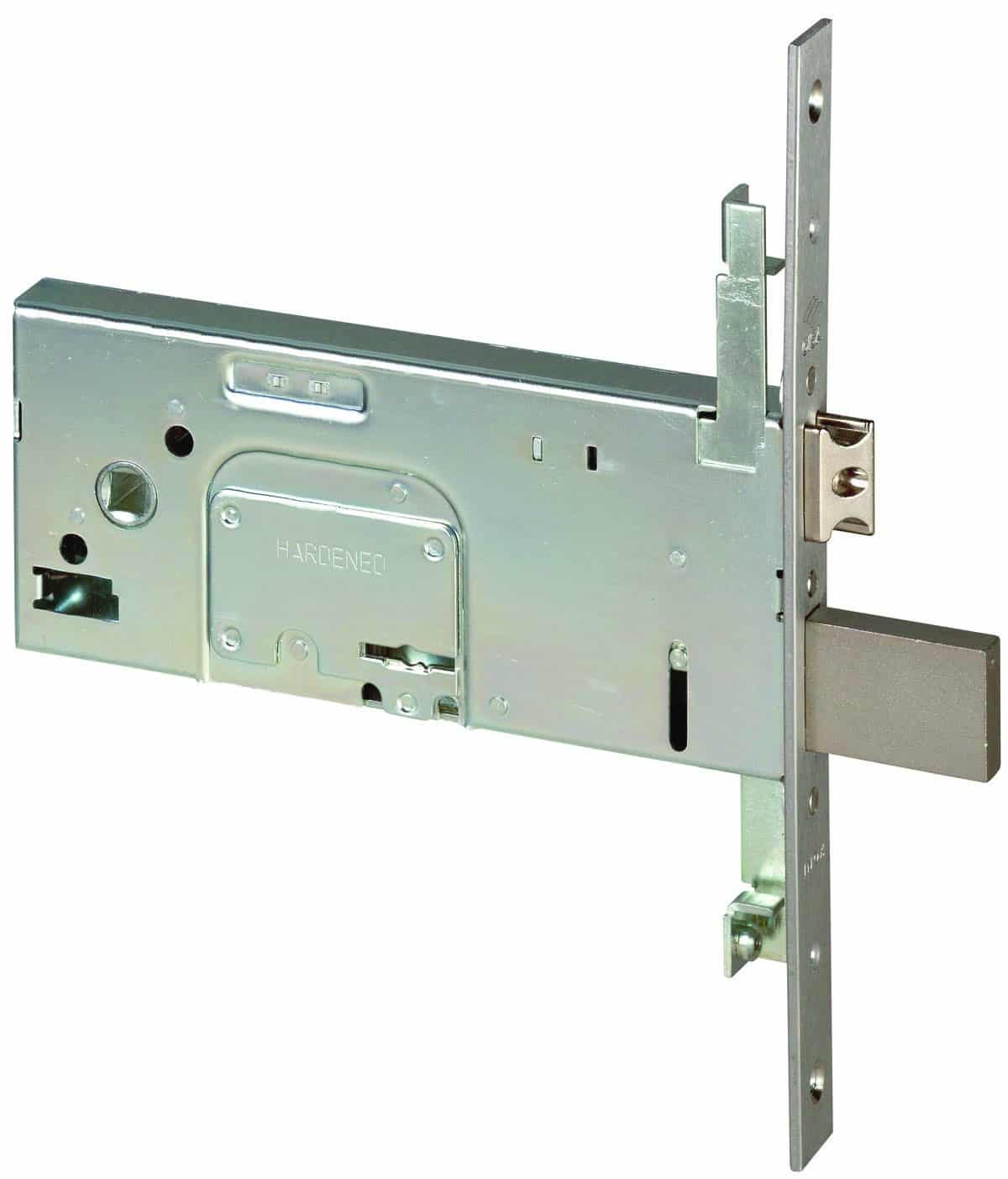 Serratura a doppia mappa da infilare per fasce. 4 mandate e scrocco regolabile, protezione antitrapano, 3 punti di chiusura, senza aste, 2 chiavi, zincata, scatola mm. 157×78.