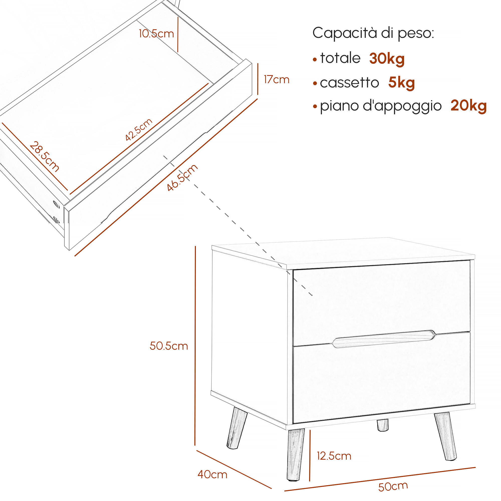 Comodino Moderno con 2 Cassetti in Truciolato e Gambe in Legno di Pino, 50Lx40Px50,5A cm, Bianco