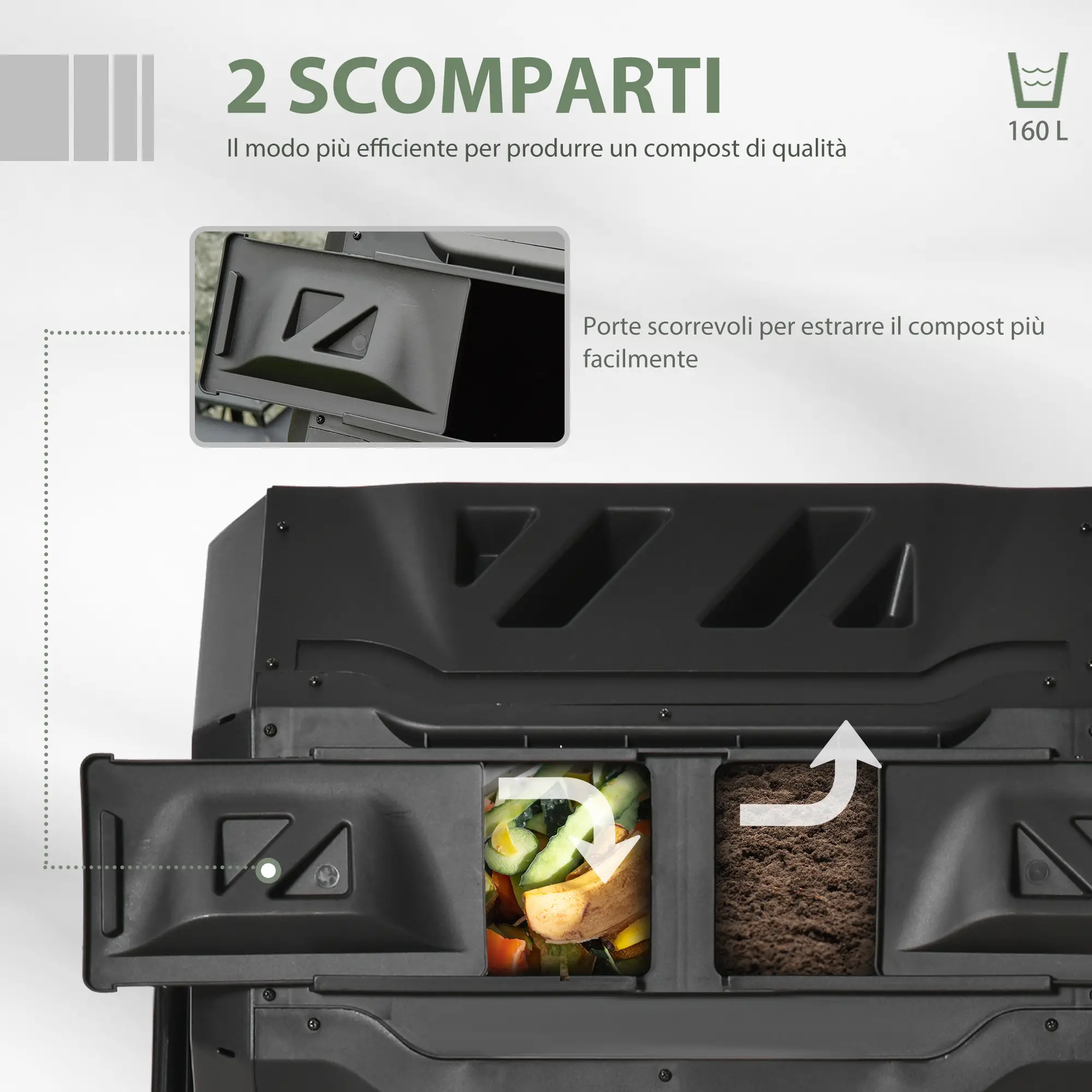 Compostiera da Giardino Girevole a 2 Sezioni con 8 Prese d’Aria, Compostiera Domestica in Acciaio e PP, 160 L, per Compostaggio Rifiuti Organici, 71x65x96 cm, Nero