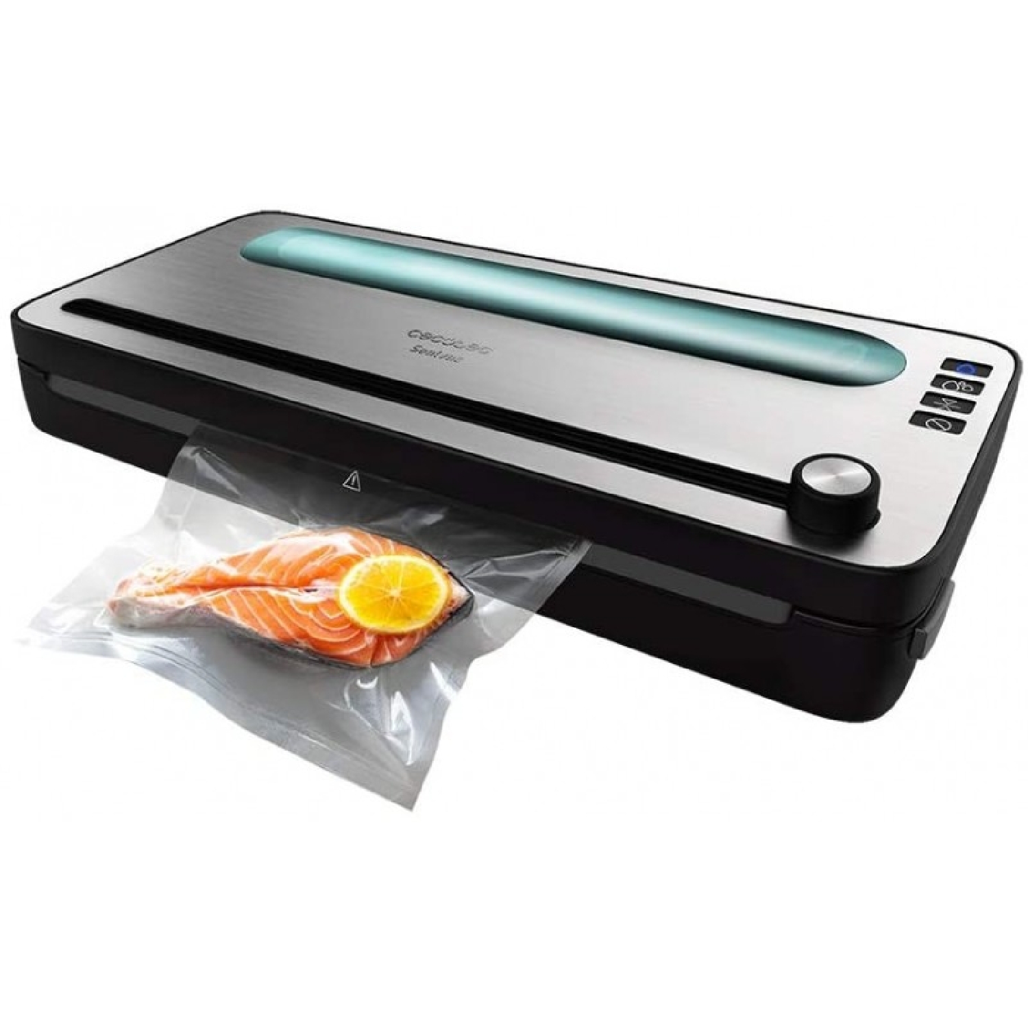 Macchina sottovuoto da 120 W e pressione sottovuoto da 0,75 bar per mantenere gli alimenti freschi per più tempo in modo molto semplice. Include taglierina e rotolo di sacchetti.