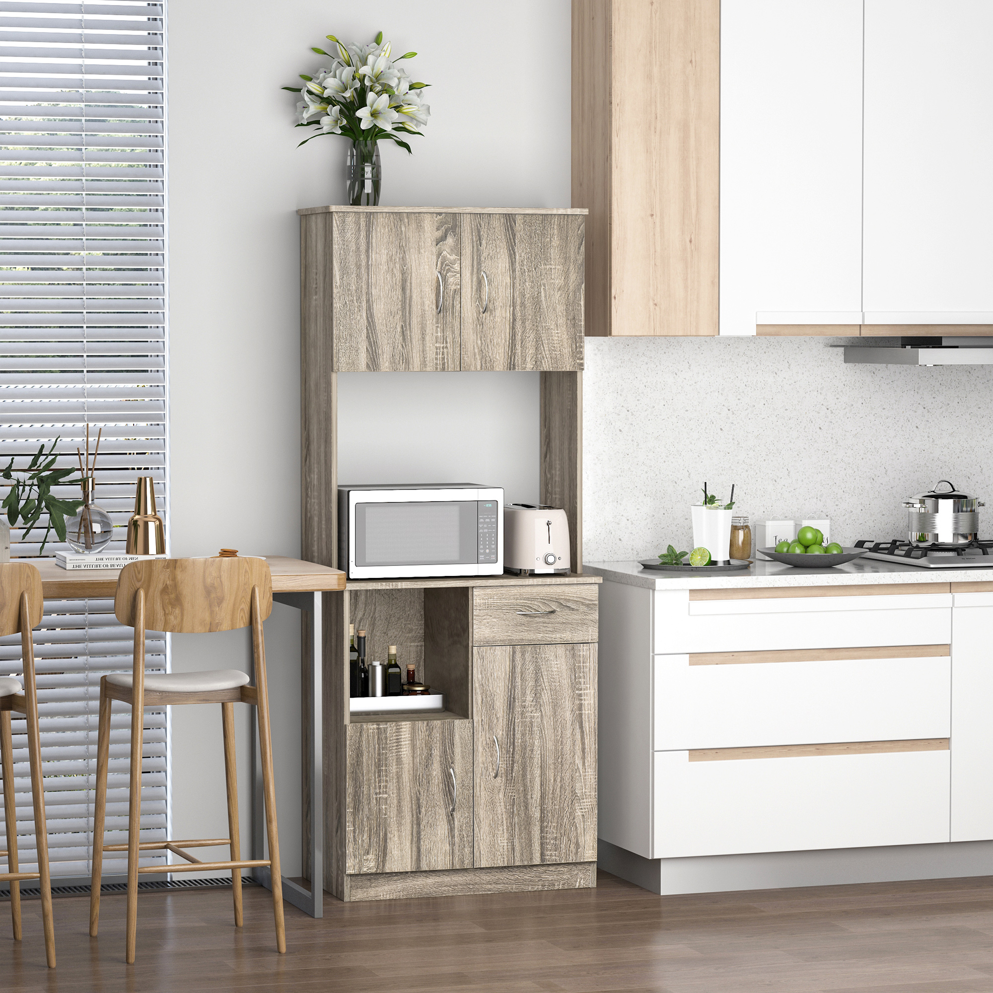 - • Il piano d’appoggio aperto è perfetto per appoggiare il forno a microonde, il tostapane, il bollitore o la macchinetta del caffè