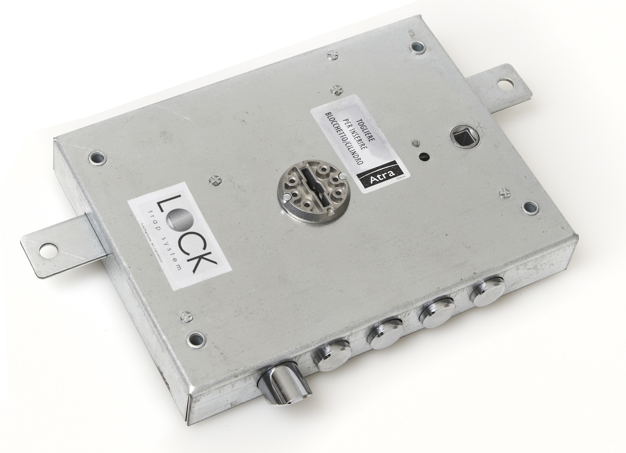 Serratura triplice da applicare a doppia mappa. 4 mandate, scrocco azionato da chiave e quadro maniglia, blocchetto con 3 chiavi mm. 92 + 1 da cantiere, scatola mm. 142×206. Confezionata in busta.