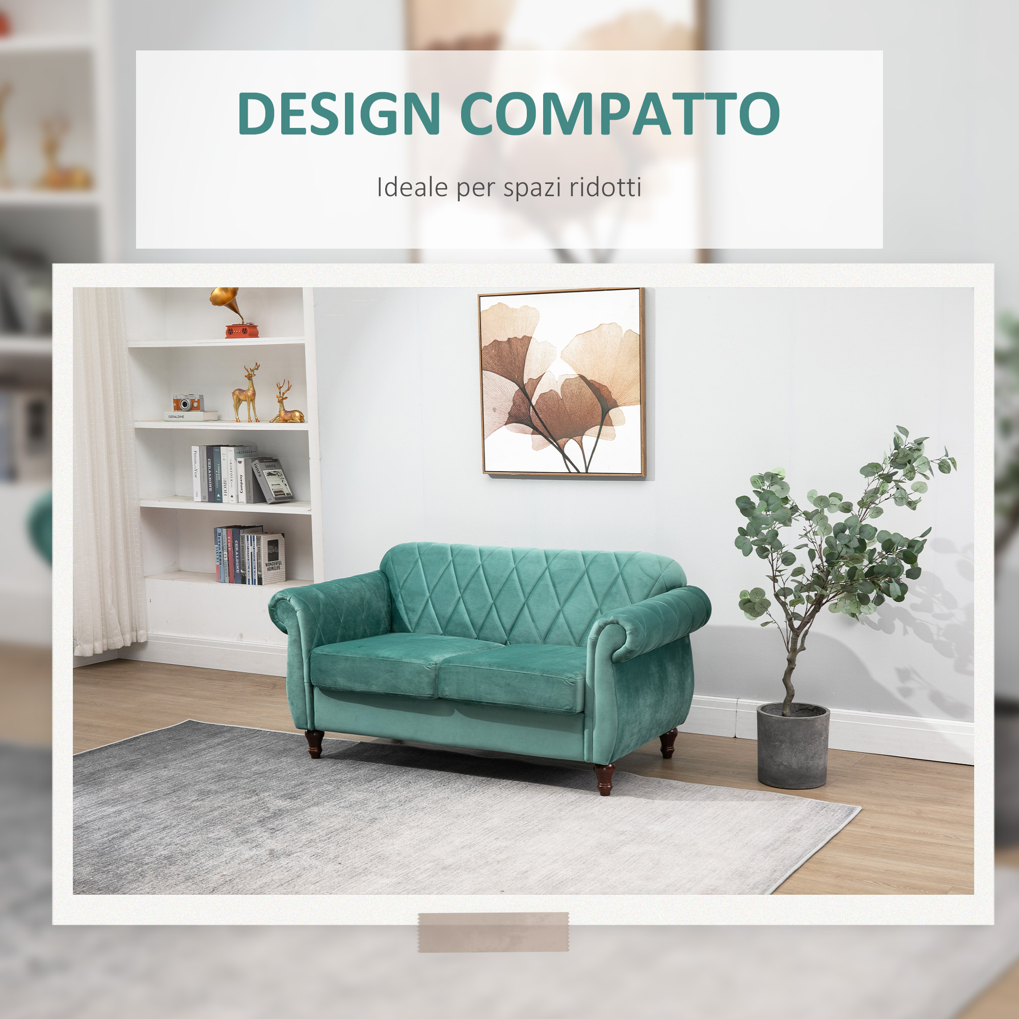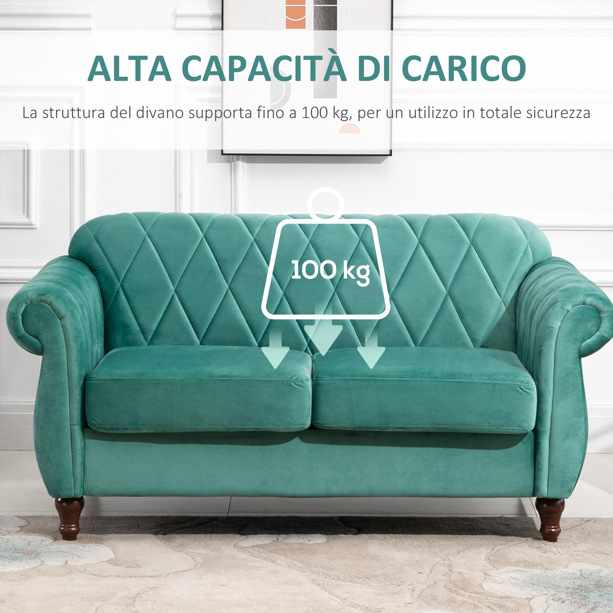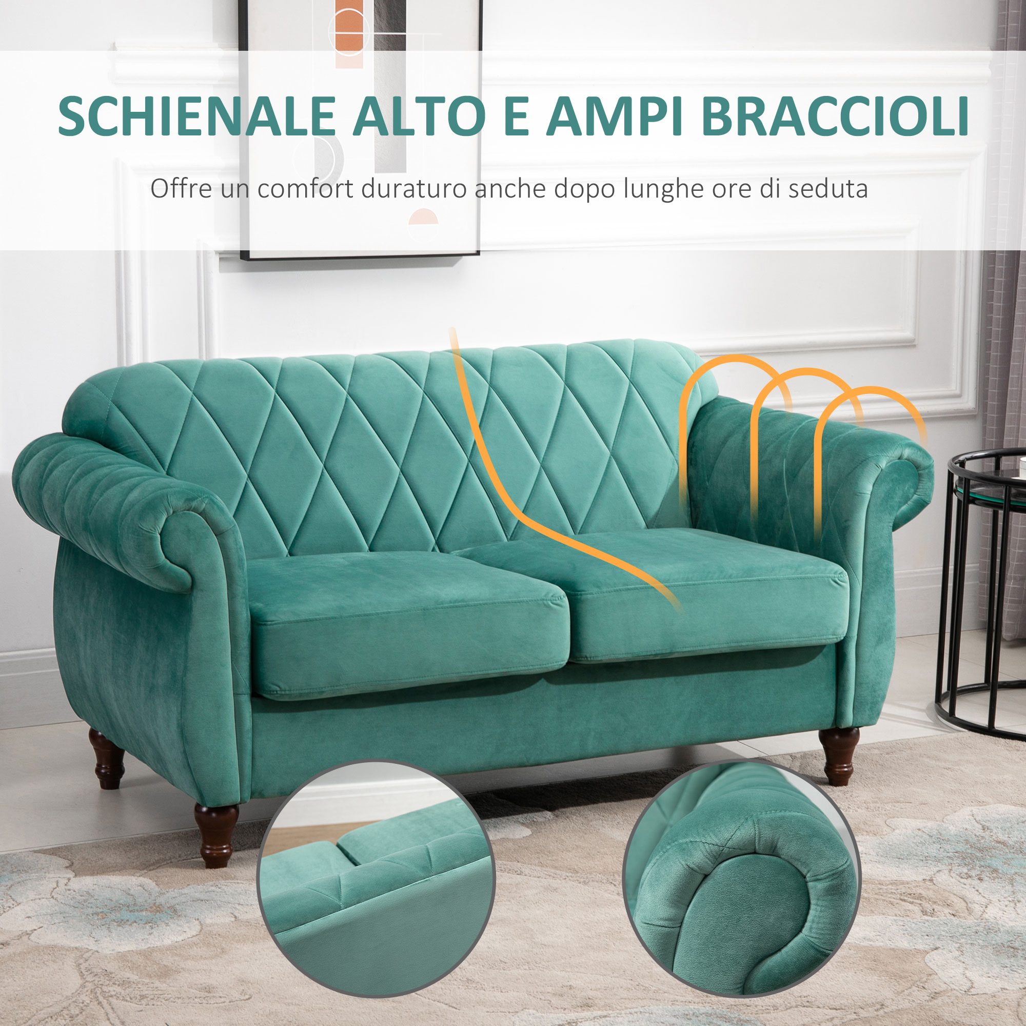 Divano 2 Posti Design Vintage Rétro in Legno e Velluto, 148 x 72 x 76 cm, Verde
