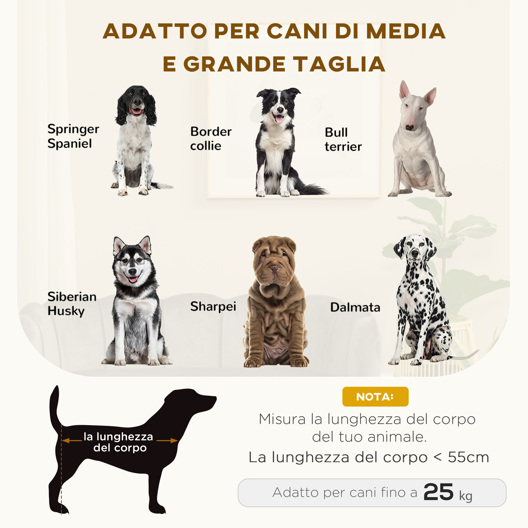 - • Per cani di taglia grande e media con altezza inferiore a 55 cm e di peso inferiore a 25 kg