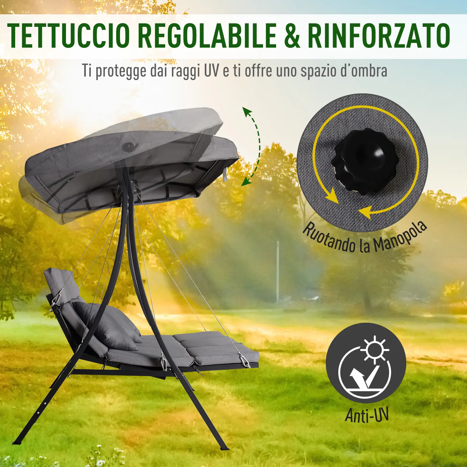 - TETTUCCIO REGOLABILE: Il tettuccio impermeabile è in grado di filtrare i raggi UV, per offrirti uno spazio fresco e ombreggiato. Inoltre, puoi facilmente regolarne l’angolazione in base alle tue esigenze mentre ti rilassi sul dondolo da terrazza